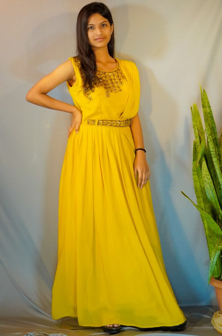 Elevate your style with this exquisite marigold yellow gown, a masterpiece of modern ethnic design. Crafted from a luxurious and lightweight georgette, this gown drapes beautifully, offering both elegance and comfort. The bodice is a work of art, featuring a stunning array of hand-stitched sequins and beads that catch the light with every movement. A decorative, embellished belt cinches the waist, creating a flattering silhouette, while a unique draped element flows from the shoulder, adding a touch of contemporary flair. This outfit is a perfect blend of traditional craftsmanship and modern sensibilities, making it a must-have for your wardrobe. Pair it with golden heels and statement earrings for a truly unforgettable look.