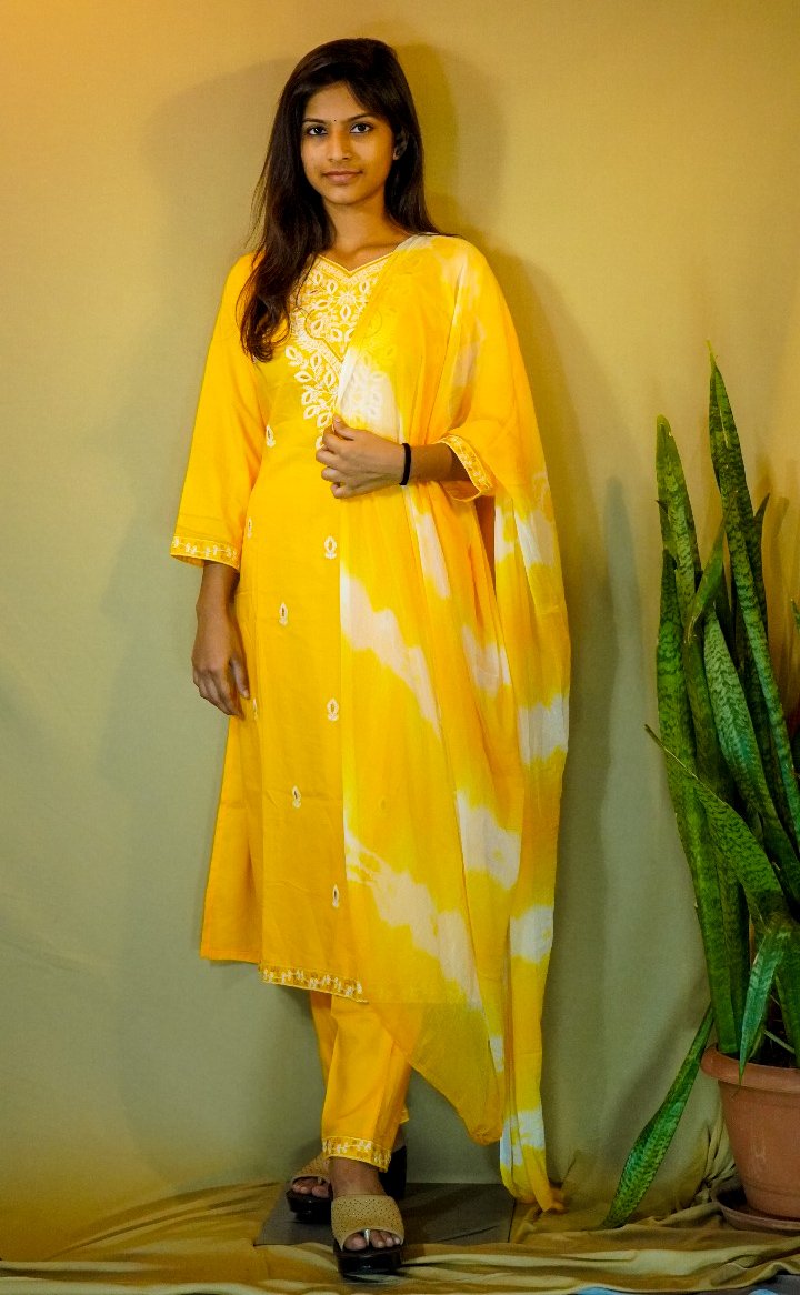 Step into a world of timeless elegance with this stunning three-piece suit set. It features a radiant marigold yellow kurta crafted from the finest pure cotton, offering a soft, luxurious feel against the skin. The intricate Lucknowi Chikankari embroidery, meticulously done by skilled artisans, adorns the kurta with delicate floral and geometric motifs, creating an exquisite texture and pattern. The set is completed with pure cotton pants and a mesmerizing tie-dye dupatta in a beautiful blend of yellow and white. The unique, handcrafted tie-dye pattern on the dupatta adds a contemporary touch, making this outfit a perfect fusion of traditional and modern aesthetics. This ensemble is designed for comfort and style, making it an ideal choice for a festive brunch, a daytime celebration, or a graceful office look. Pair it with minimalistic silver jewelry and a pair of juttis to complete the look.