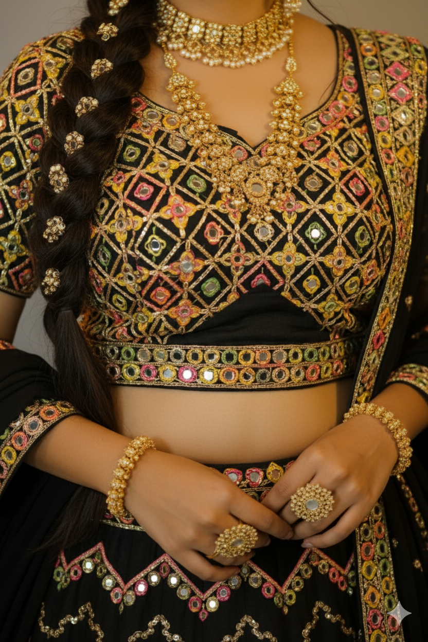 Black & Multicolor Embroidered Lehenga Set with Mirror Work