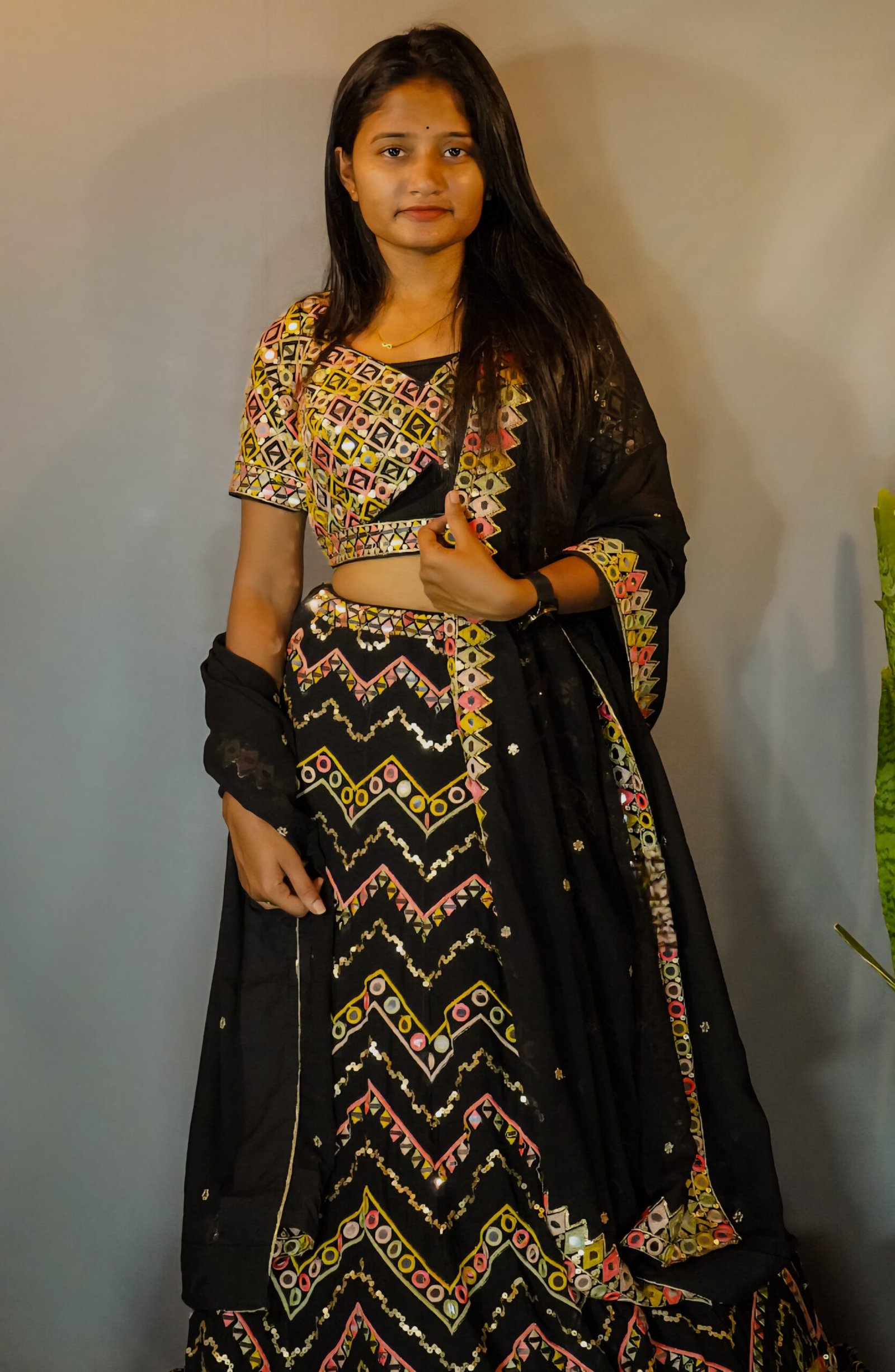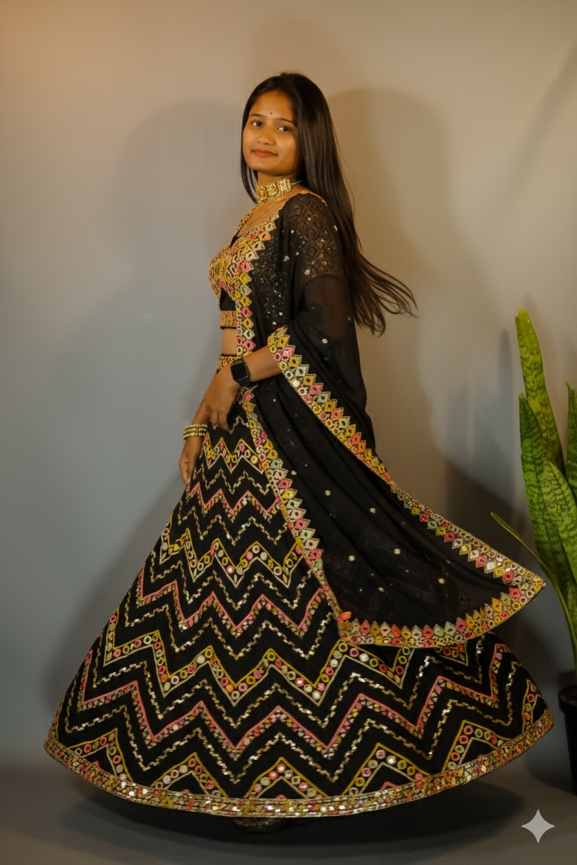 A breathtaking black lehenga choli set featuring dazzling mirror work and intricate multicolor embroidery in a striking zig-zag pattern. This festive ensemble is perfect for making a bold statement.