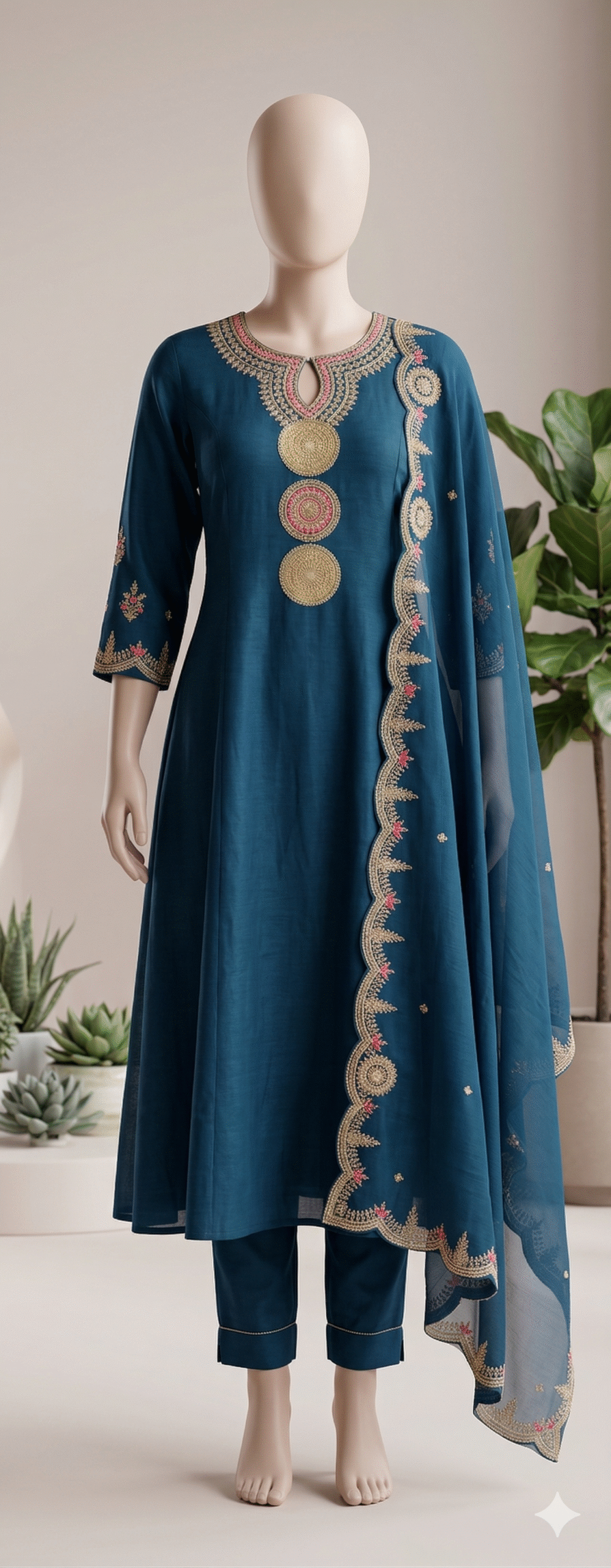 Exude grace and sophistication in this deep teal suit set. The flared kurta features a unique circular medallion embroidery along the neckline and center, accented with delicate pink threadwork. Paired with matching cigarette pants and a sheer dupatta with an intricate gold scalloped border, this ensemble is a masterclass in elegant design.