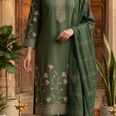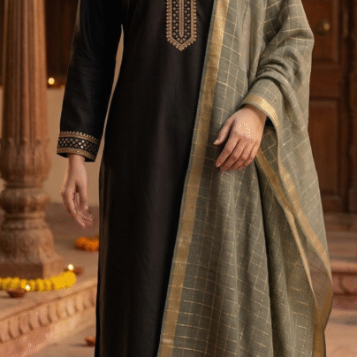 Look sharp and stylish in this beautiful 3-piece black suit set. The long top (kurta) has pretty white flower prints and a cool striped neck design. The sleeves and bottom edges also have matching patterns to keep the look clean and classy.