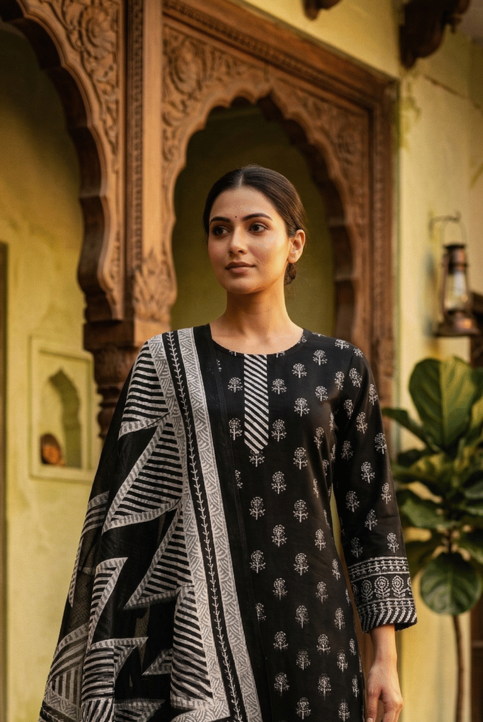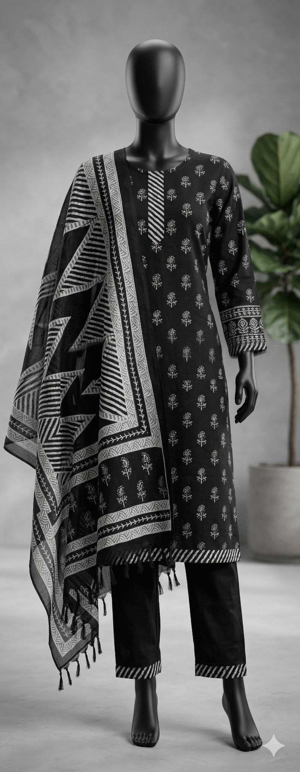 The set comes with comfortable black pants that have a matching striped border at the ankles. It also includes a lightweight scarf (dupatta) with bold stripes and flower designs, finished with fun tassels on the ends. This outfit is perfect for anyone who loves the classic look of black and white.