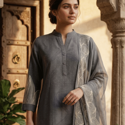Elegant Grey Leaf Print Kurta Set with Subtle Artistic Design