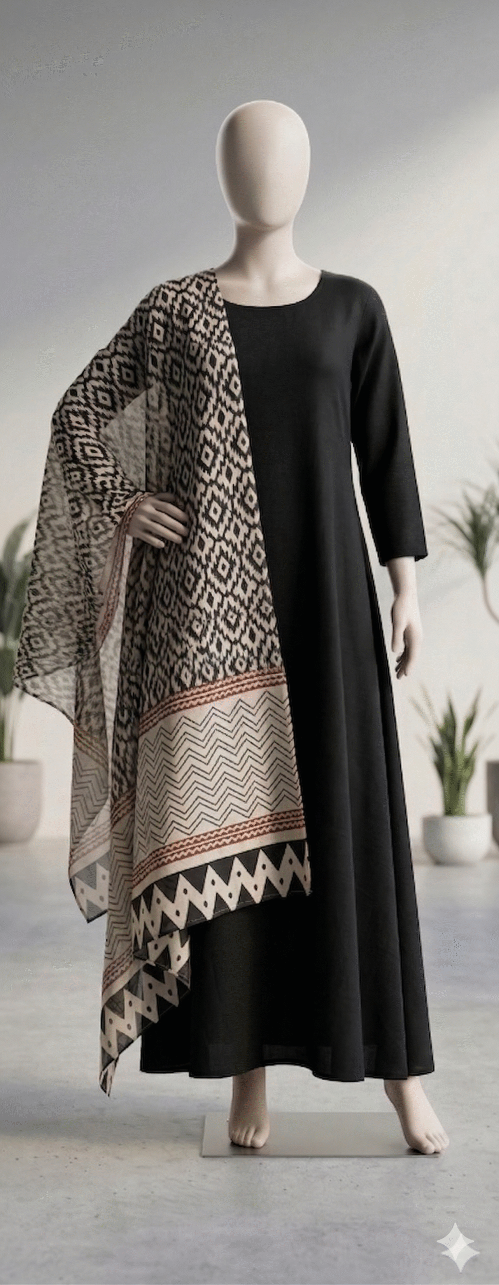 Elegant Black A-Line Kurta with Ikat Print Dupatta Set