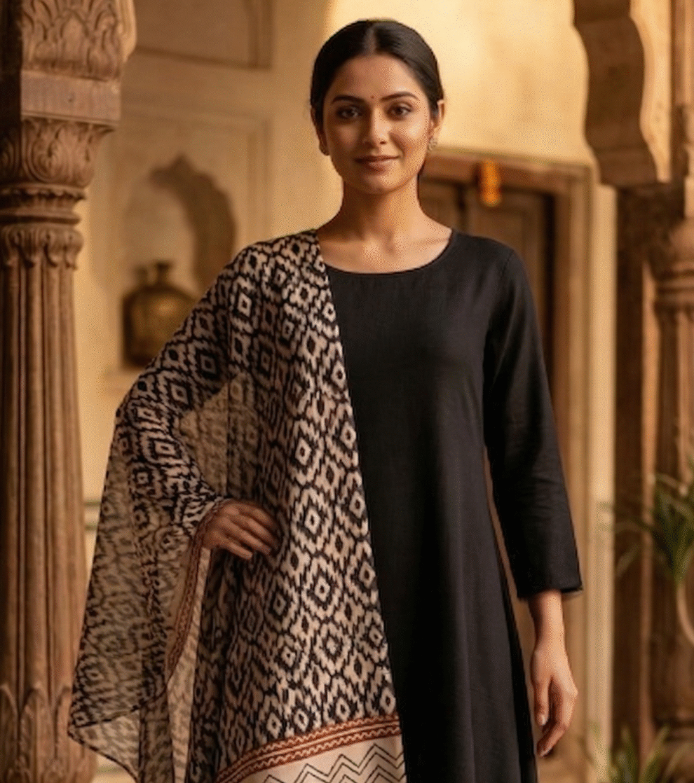 The highlight of the outfit is the beautifully crafted dupatta featuring traditional ikat-inspired patterns in black and beige tones. The geometric designs and detailed borders add a rich ethnic charm, perfectly complementing the simplicity of the kurta.