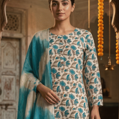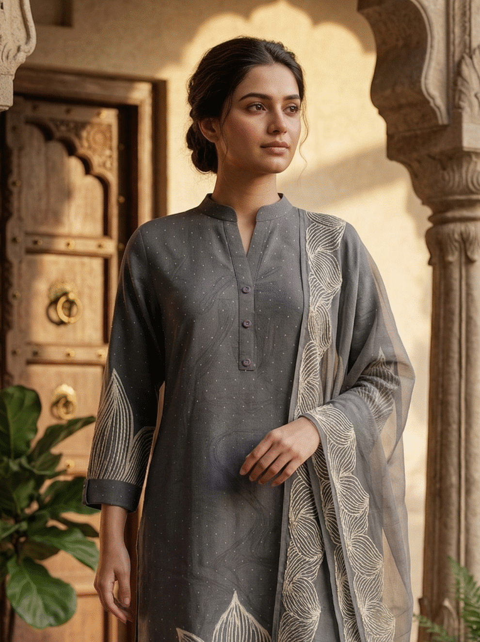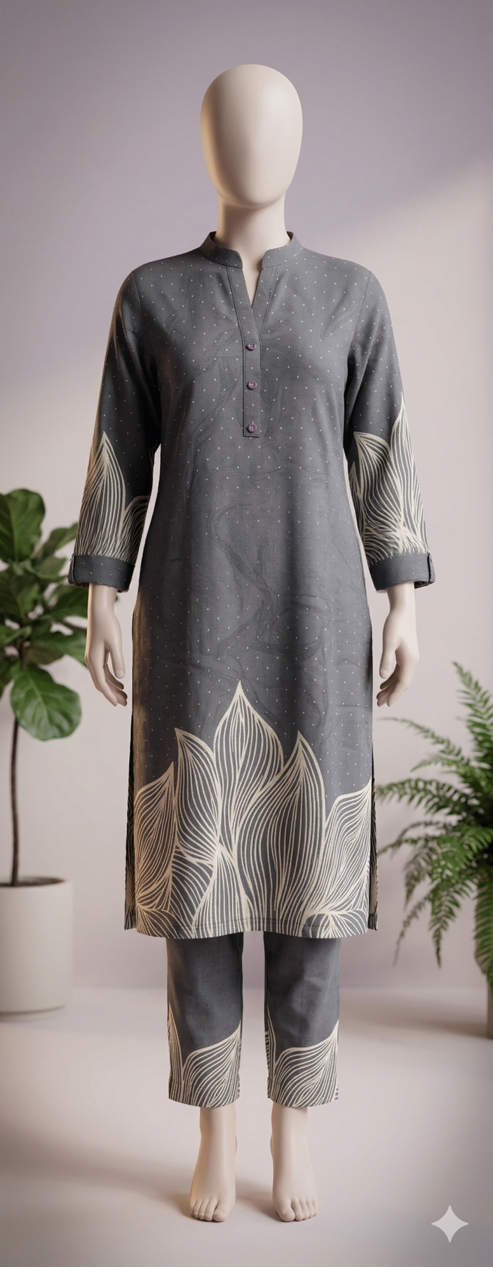 Bring a touch of understated elegance to your wardrobe with this beautiful grey 2-piece kurta set. The kurta features a graceful leaf-inspired design in soft beige tones, creating a calm and sophisticated look. The minimal dotted pattern across the fabric adds a modern twist to this classic outfit.