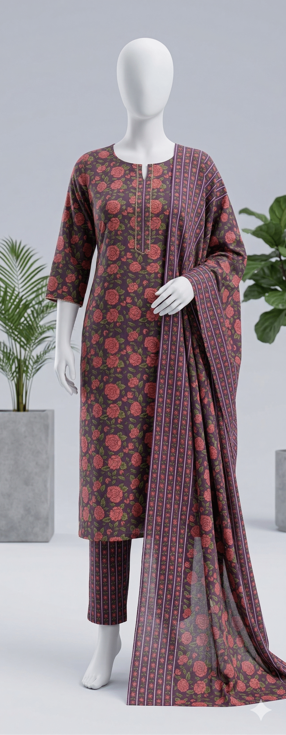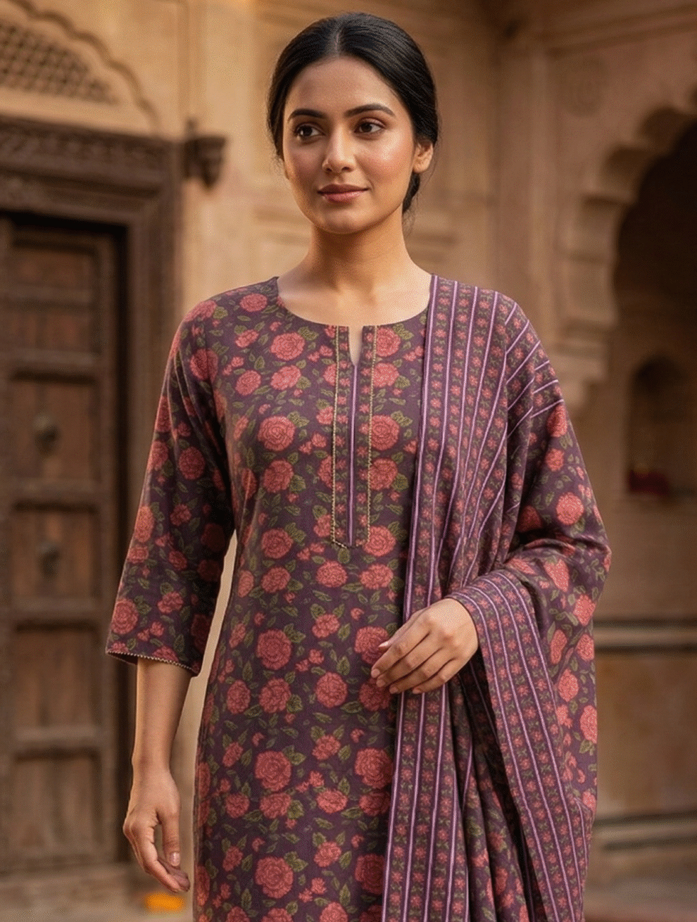 Embrace timeless elegance with this beautifully designed maroon 3-piece suit set, perfect for both festive occasions and everyday sophistication. The kurta features an all-over floral print in soft pink tones, creating a graceful and classic look against the rich maroon base.