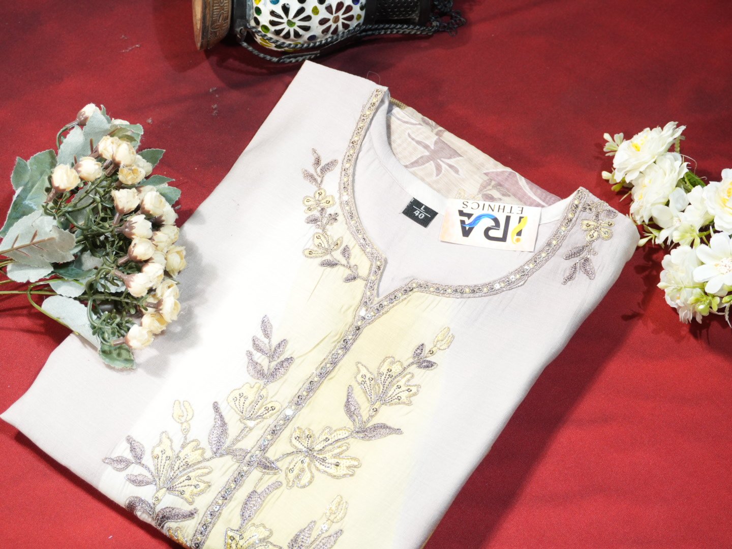 A soft beige and lemon pastel kurta set featuring delicate floral embroidery on the neckline and front panel. Paired with a matching bottom and a lightweight floral dupatta, this outfit blends comfort with timeless elegance—perfect for festive and casual occasions.