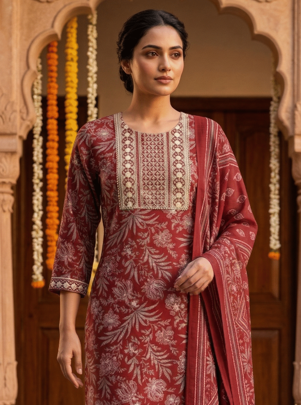 Add timeless charm to your wardrobe with this stunning red 3-piece suit set, designed to make a graceful statement. The kurta features intricate floral prints in soft beige tones, beautifully spread across the fabric for a rich and elegant look. The highlight of the outfit is the detailed embroidered panel on the chest, adding a touch of traditional craftsmanship and sophistication.
