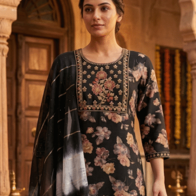 Completing the set is a matching dupatta adorned with coordinated floral and border prints, adding flow and elegance to the overall ensemble. Perfect for festive occasions, office wear, or casual gatherings where you want to look effortlessly graceful.