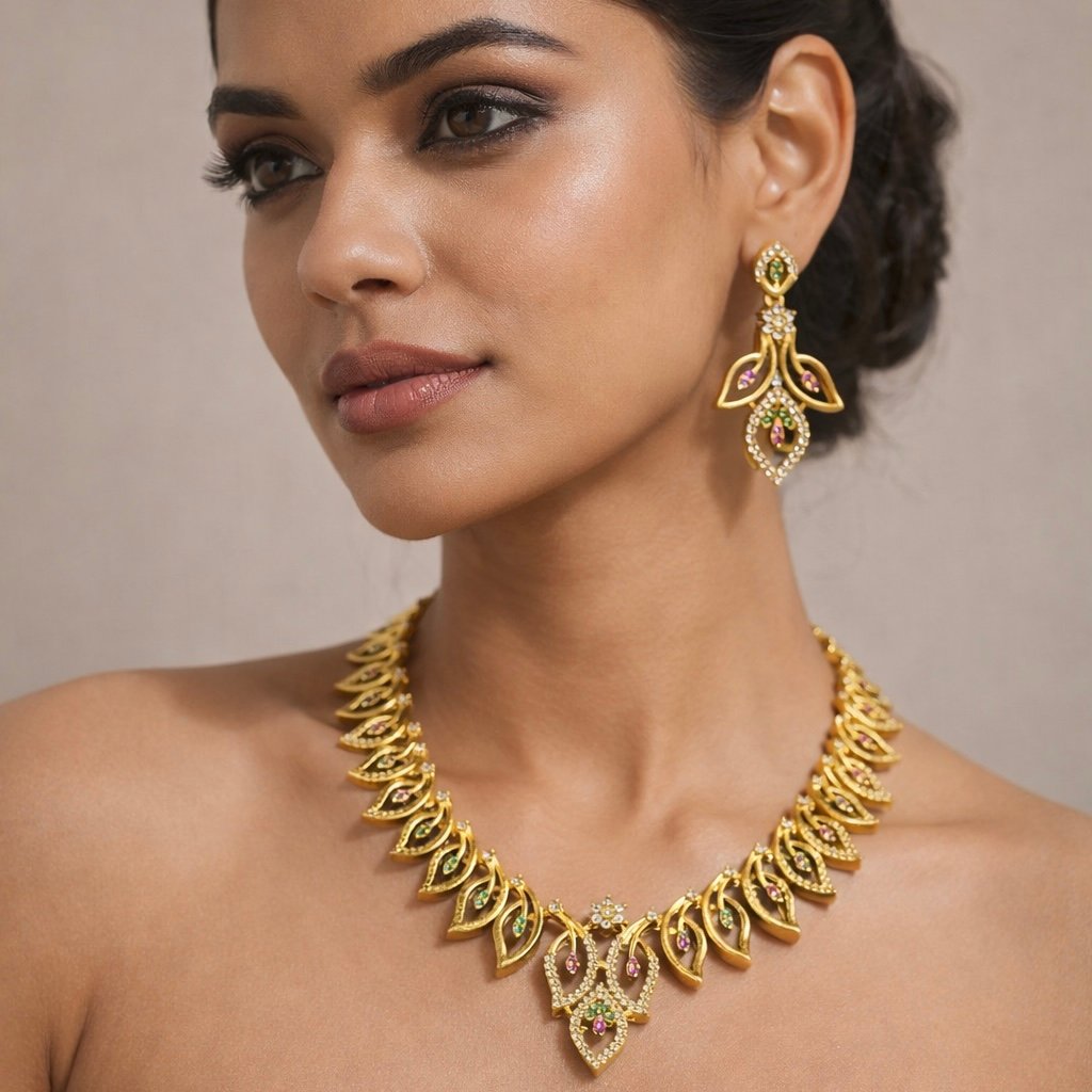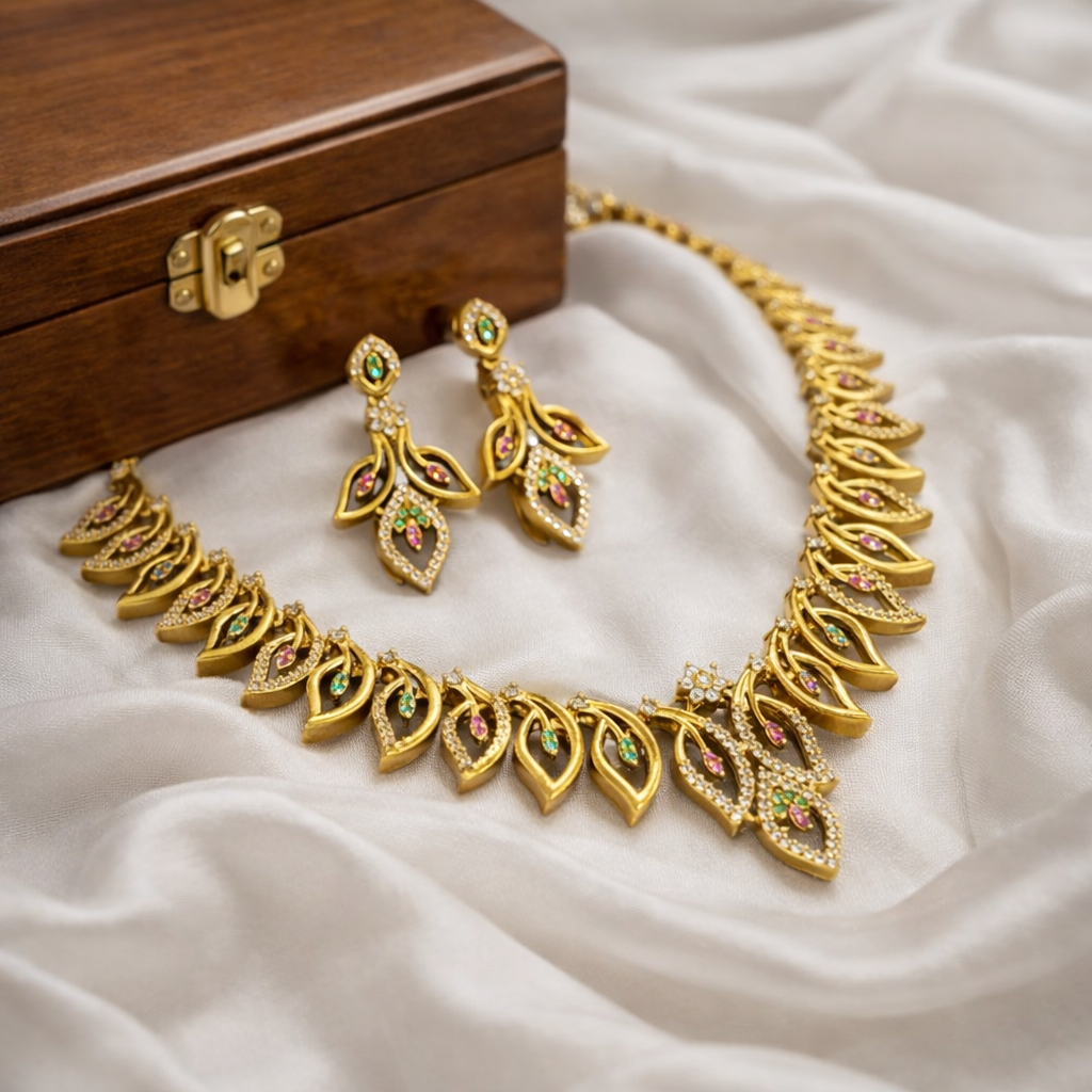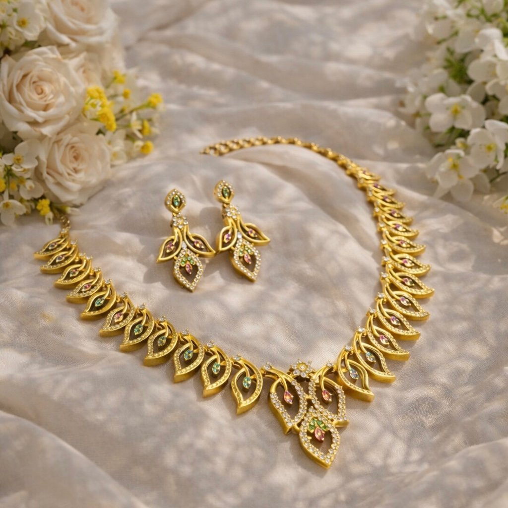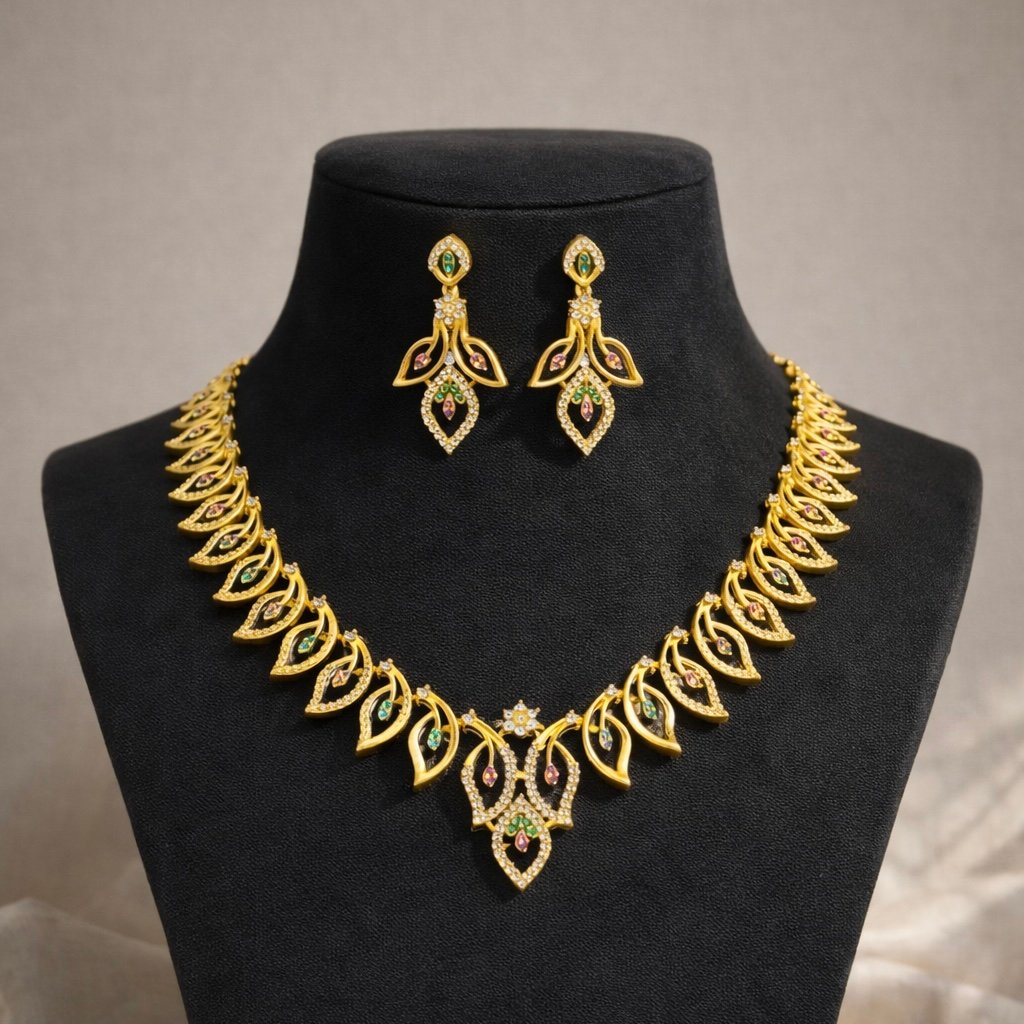 Elegant gold-tone necklace set featuring a stylish leaf design with multicolor stone accents and matching earrings. Perfect for festive occasions, weddings, and party wear