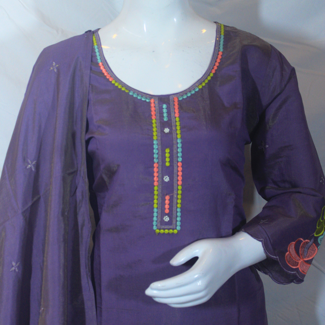 ✨ Description: Step into elegance with our "Lavender Garden Kurta Set", designed to bring calm hues and handcrafted beauty to your festive wardrobe. The vibrant floral embroidery with sequin detailing and matching dupatta create a complete look that's sophisticated yet simple. 📏 Set Includes: • Kurta + Bottom + Dupatta (3-piece set) 🧵 Fabric & Fit: • Fabric: Soft Cotton Blend • Kurta Length: Knee-length (straight cut) • Bottom: Straight pants • Dupatta: Full length with floral motifs • Fit: Regular fit | Breathable | All-day comfort 🌸 Design Highlights: • Intricate multicolor floral embroidery on kurta & dupatta • Embellished neck detailing with mirror accents • 3/4th sleeves with floral cuffs • Earthy lavender tone perfect for all skin tones 🎯 Occasions: • Ethnic day at office • Casual gatherings • Light family functions • Gift for mom or sister 🧼 Care Instructions: • Gentle hand wash recommended • Dry in shade to preserve embroidery