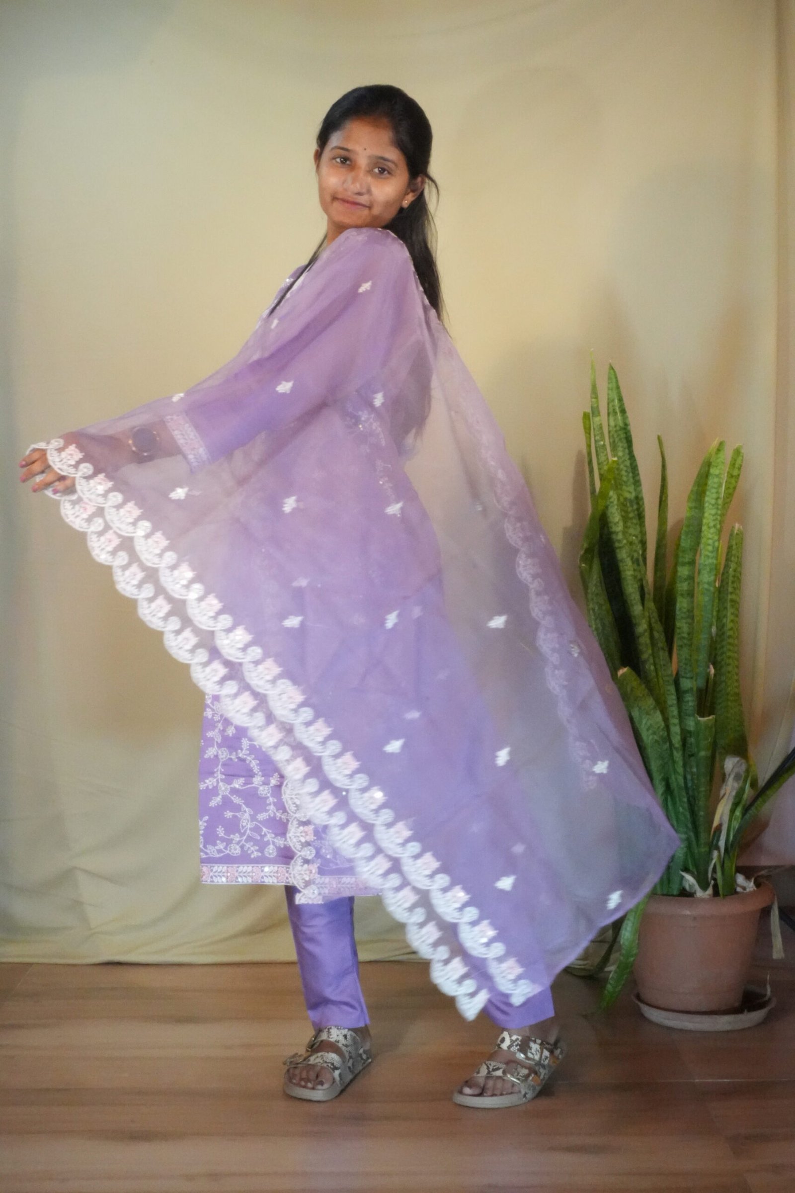 Step into timeless grace with this Lilac Anarkali Suit Set. It features intricate Chikankari-style embroidery and a beautiful, flowing Organza Dupatta. Perfect for special festive and evening occasions.