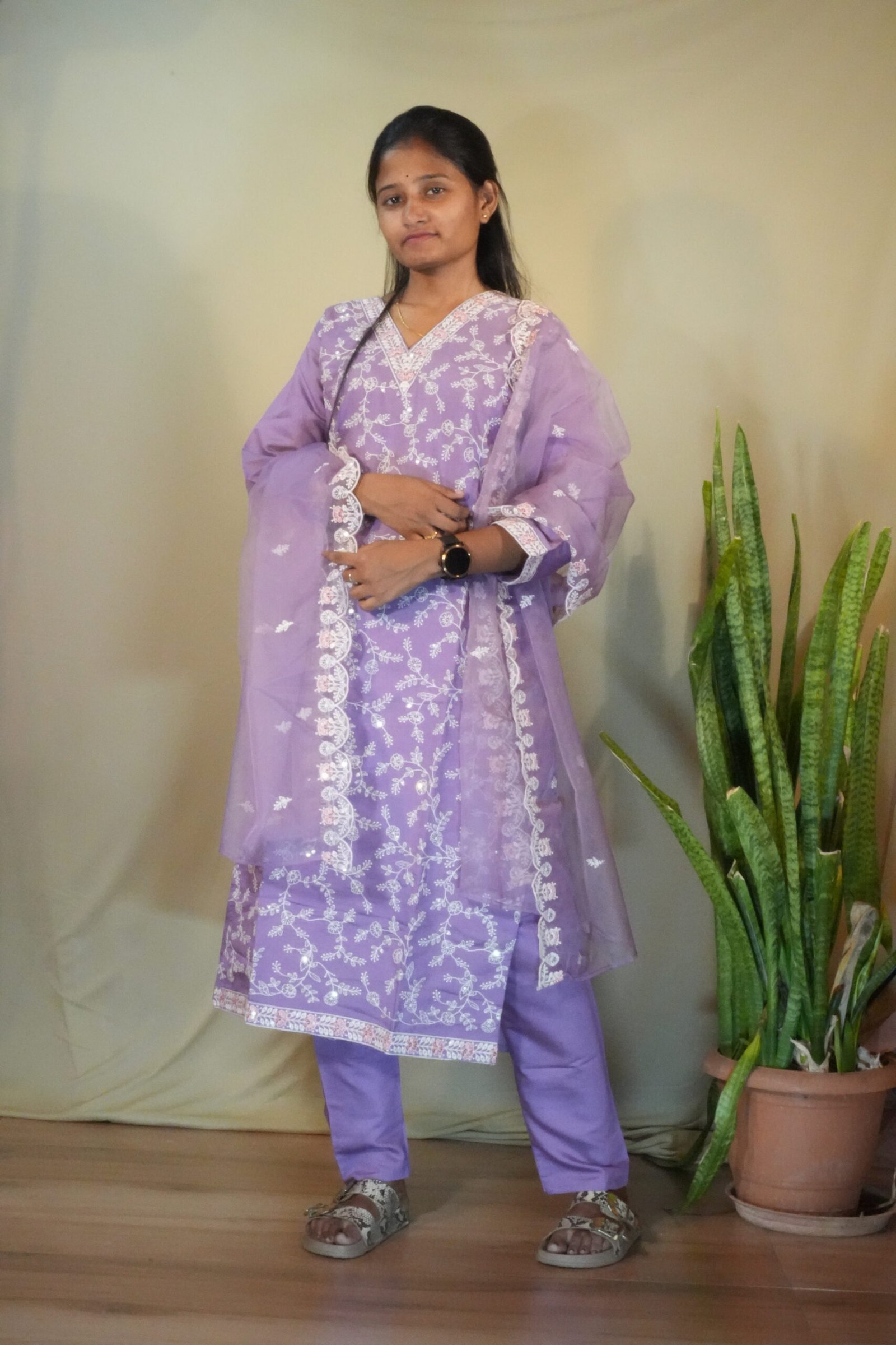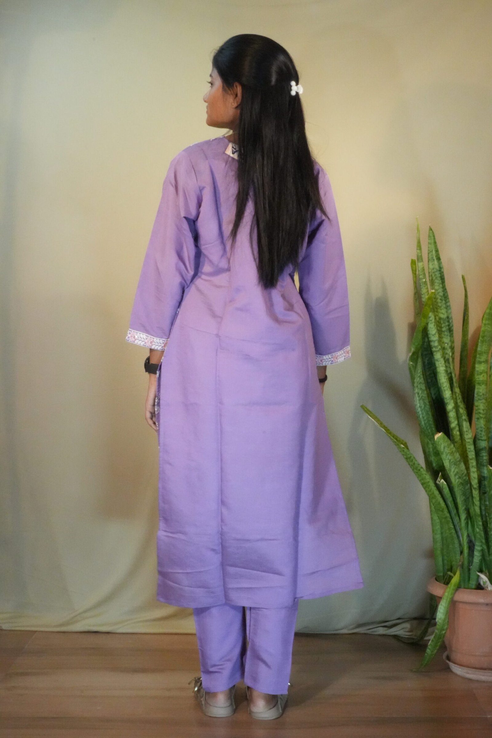 Step into a world of ethereal elegance with our Lilac Anarkali Suit Set. Its soothing pastel shade and traditional Chikankari-inspired detailing create a look of effortless grace, perfect for making a memorable impression at any celebration.