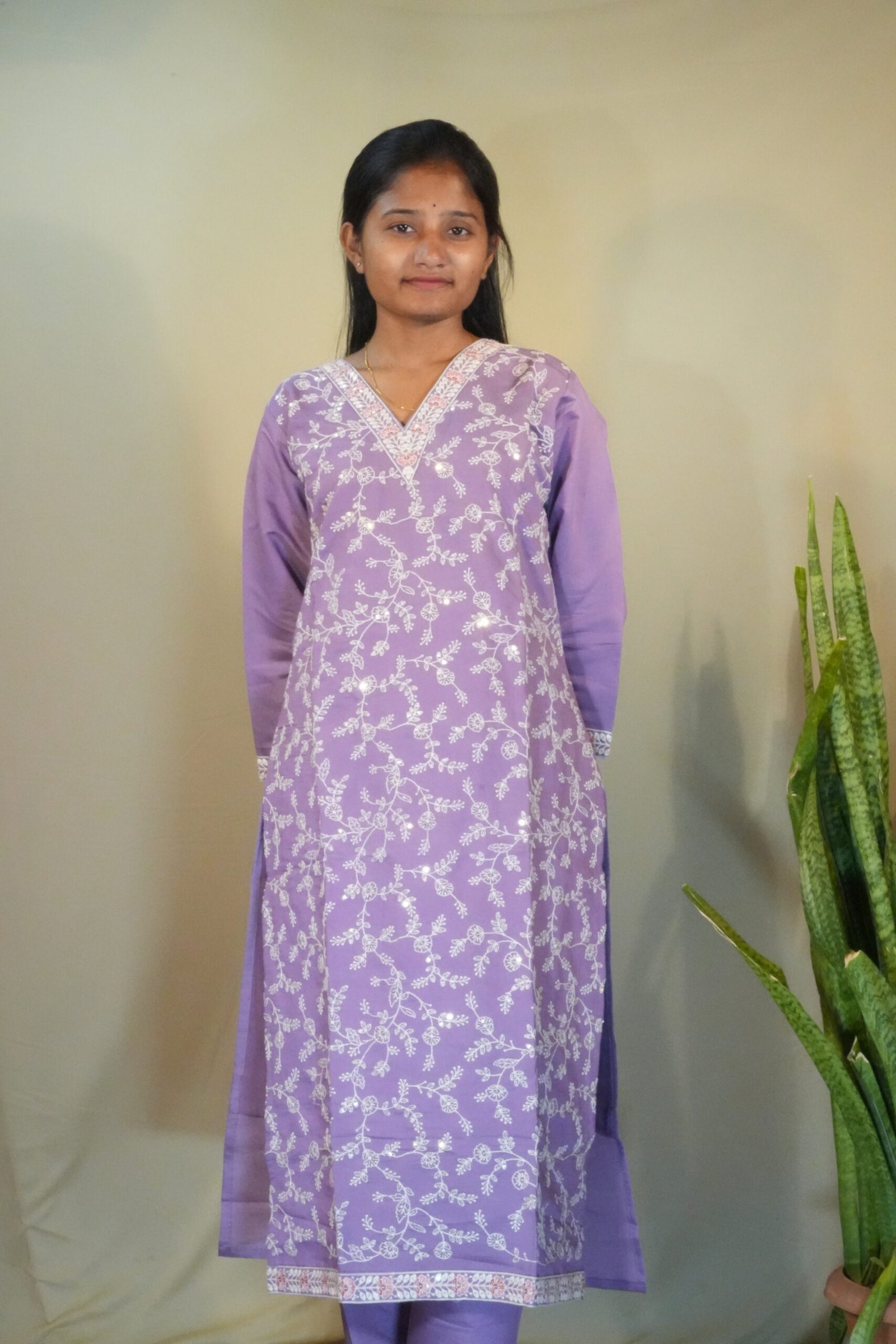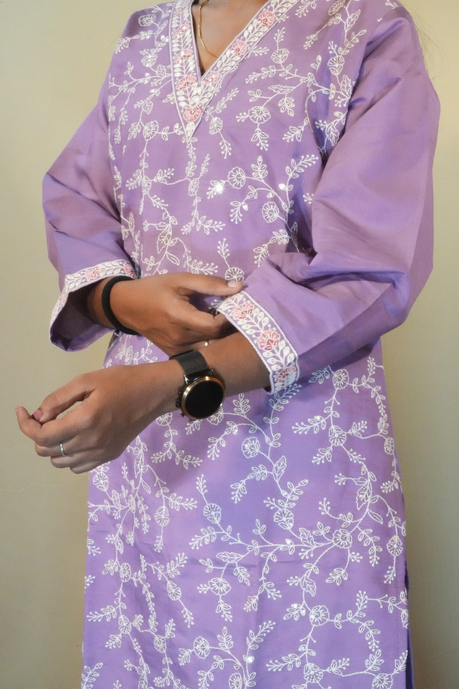 - Pattern: All-over Chikankari-style Embroidery/Sequence Work.