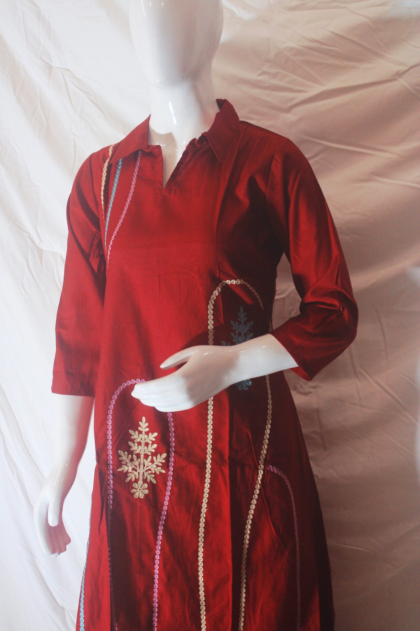 • Work: Multicolor vertical thread embroidery with floral motifs