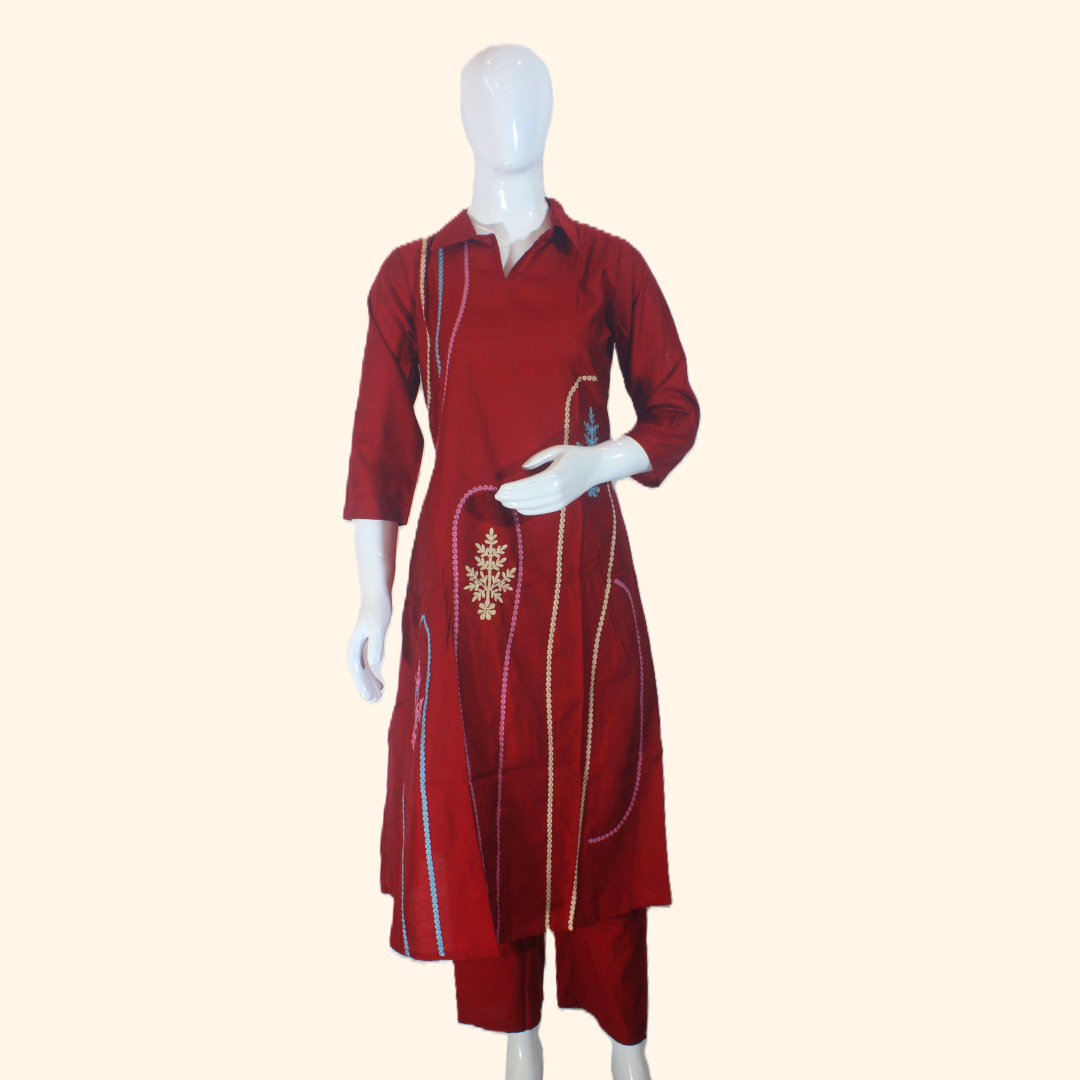 The “Rustic Bloom Ensemble” is a beautifully tailored rust red kurti paired with matching pants, featuring fine thread embroidery in pastel hues. A perfect fusion of tradition and minimalism, this set is made for those who love comfort with statement details.