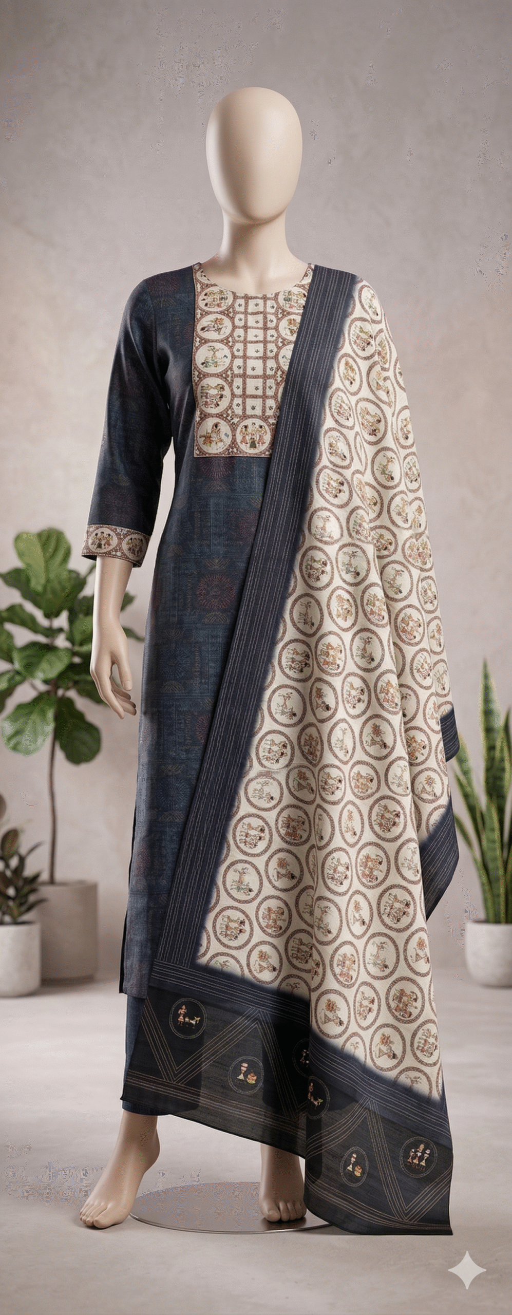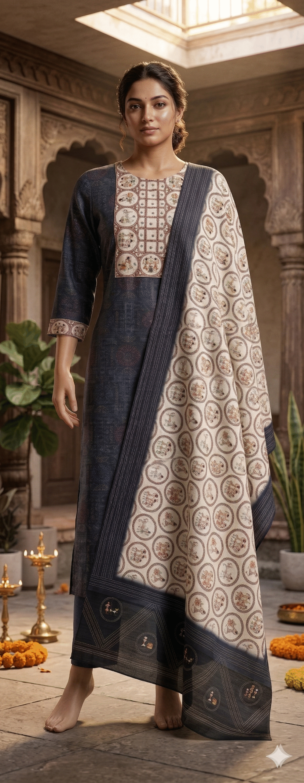 Statement Dupatta: The set is highlighted by a high-contrast cream and navy scarf. It is covered in elegant circular patterns and finished with a thick, detailed border.