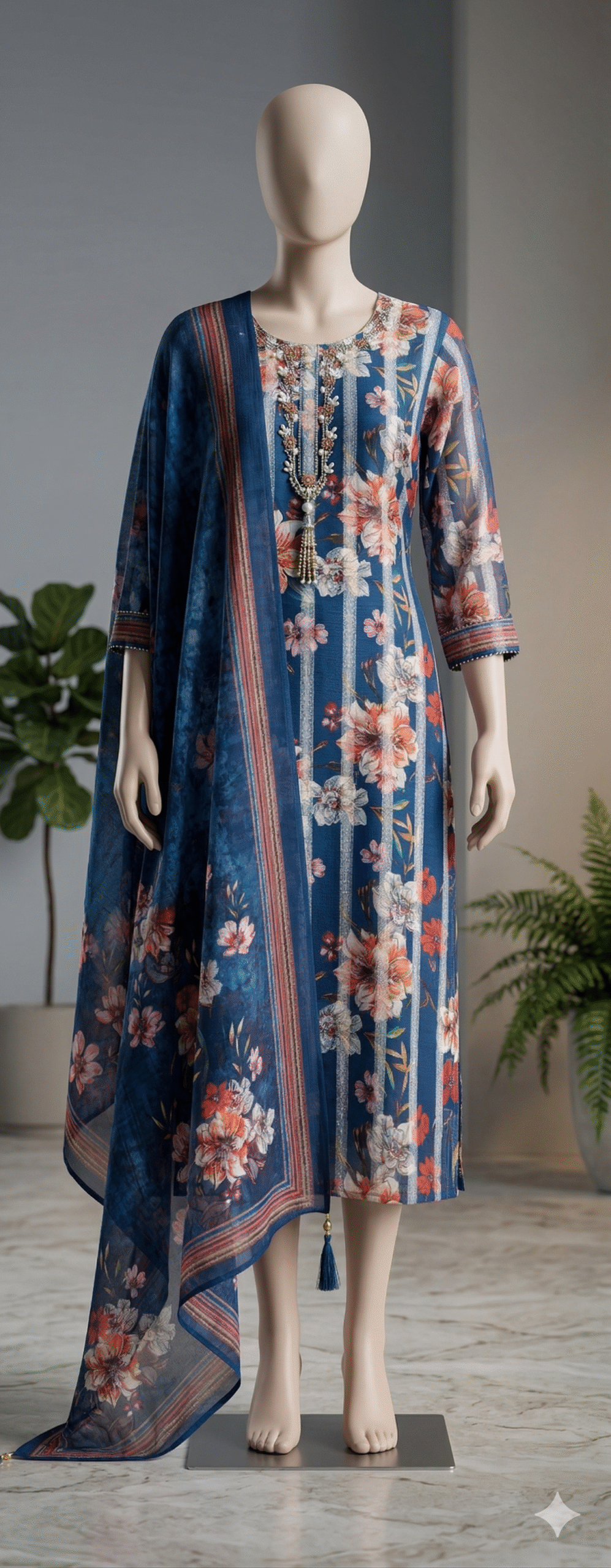 A chic 3-piece ethnic set featuring a midnight blue straight kurta with peach floral motifs and vertical stripes. The neckline is highlighted with delicate sequins and a tassel detail.