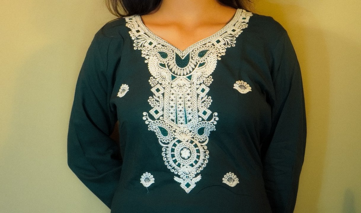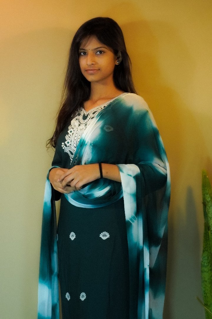 Step out in effortless style with our Obsidian Black Embroidered Suit. This elegant three-piece set is crafted from a soft, breathable cotton fabric, making it a perfect choice for all-day wear. The timeless black kurta is beautifully detailed with meticulous white thread embroidery on the neckline, adding a clean, graphic contrast. The rest of the kurta and the matching straight-cut pants feature delicate scattered motifs, enhancing the outfit’s subtle charm. The ensemble is completed with a captivating shibori tie-dye dupatta in shades of grey and white, which provides a stunning, artistic flair. This versatile suit is ideal for a formal lunch, an evening gathering, or a day at the office where you want to look polished and put-together.
