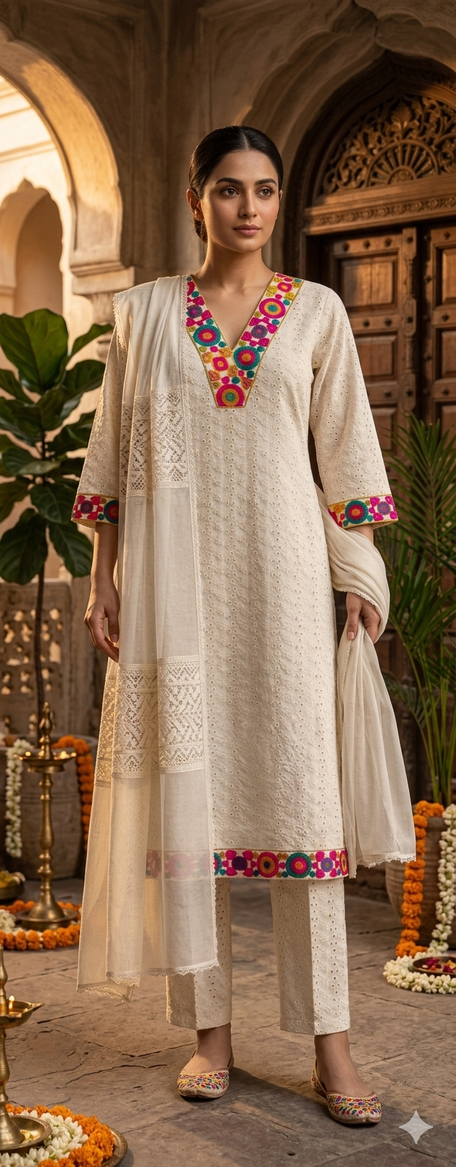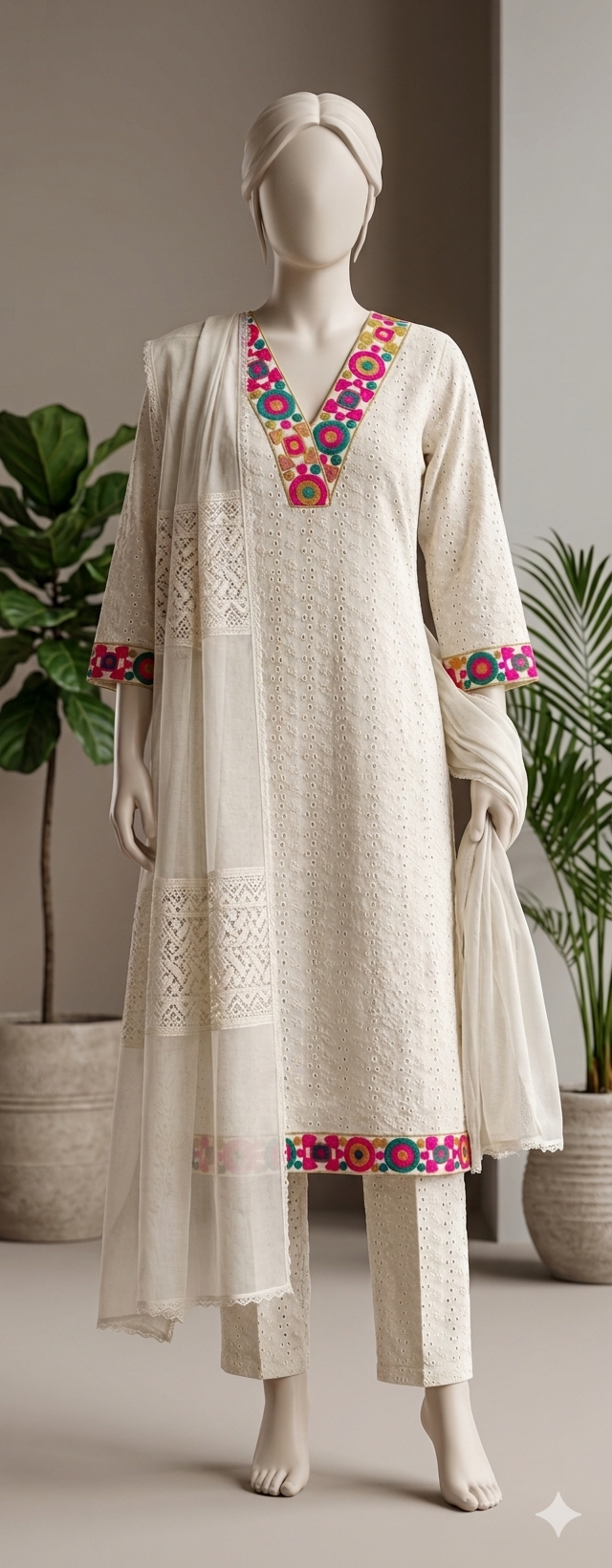 Embrace timeless elegance with this off-white 3-piece suit set. This ensemble beautifully combines the traditional art of Chikankari with a pop of vibrant, modern colors, creating a look that is both fresh and classic.