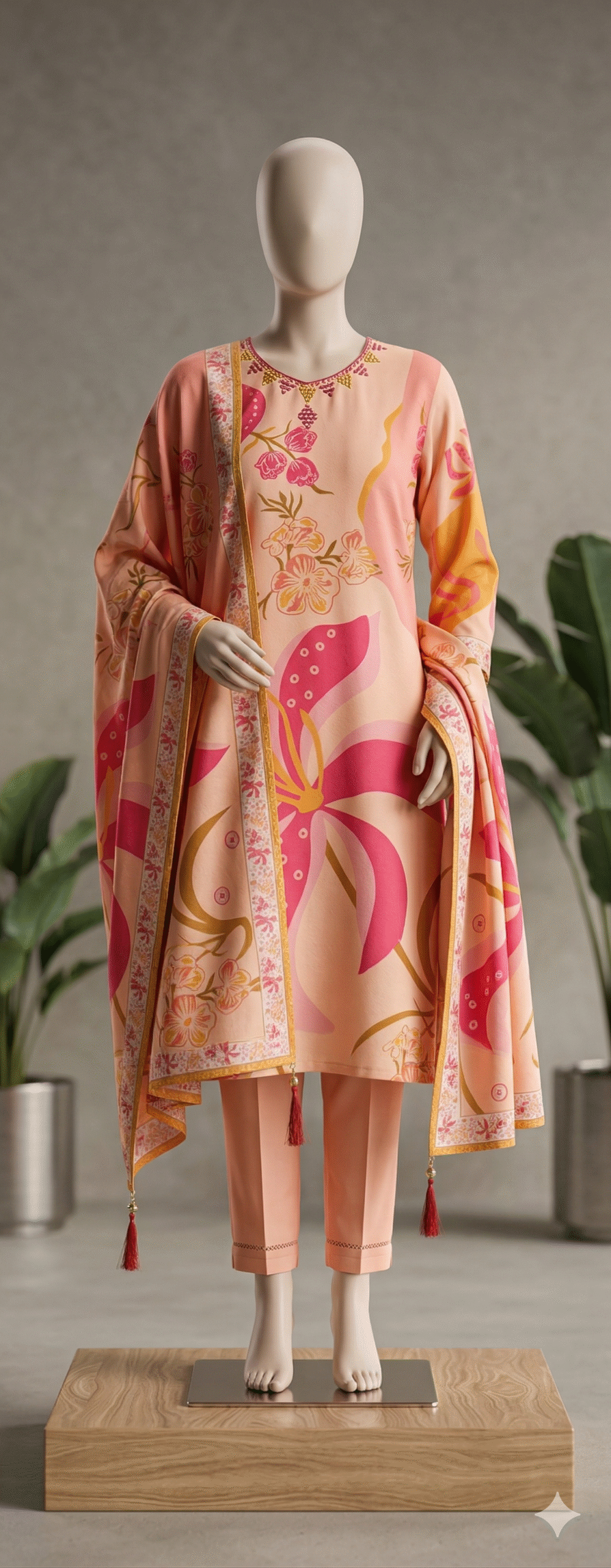 The set comes with matching peach pants that have a clean, straight fit. To finish the look, there is a matching soft scarf (dupatta) with beautiful floral borders and stylish red tassels on the corners. This bright and cheerful outfit is perfect for parties, family gatherings, or festive days.
