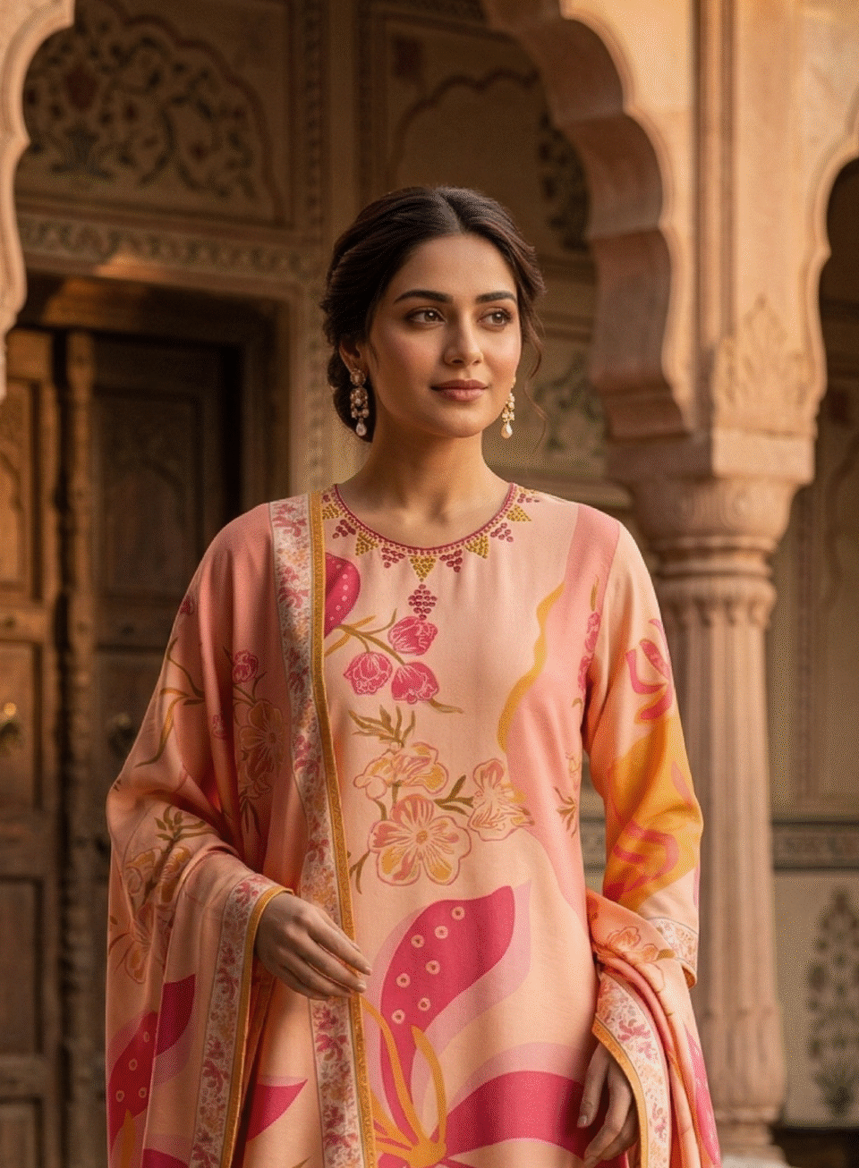 Brighten up your wardrobe with this lovely 3-piece suit set in a warm peach color. The long top (kurta) features large, colorful flower prints in shades of pink and orange. It has a pretty embroidered design around the neck that adds a special touch.
