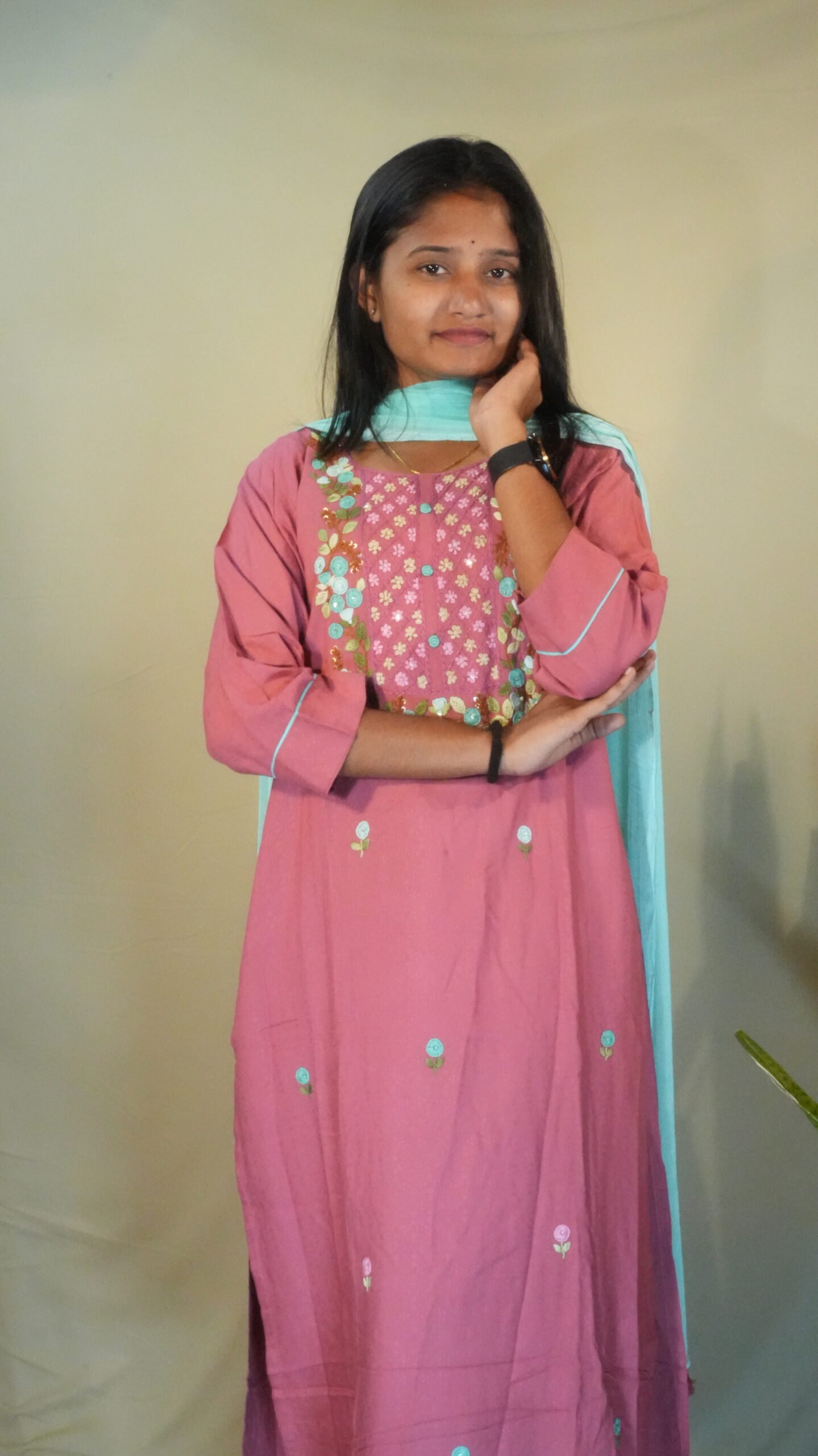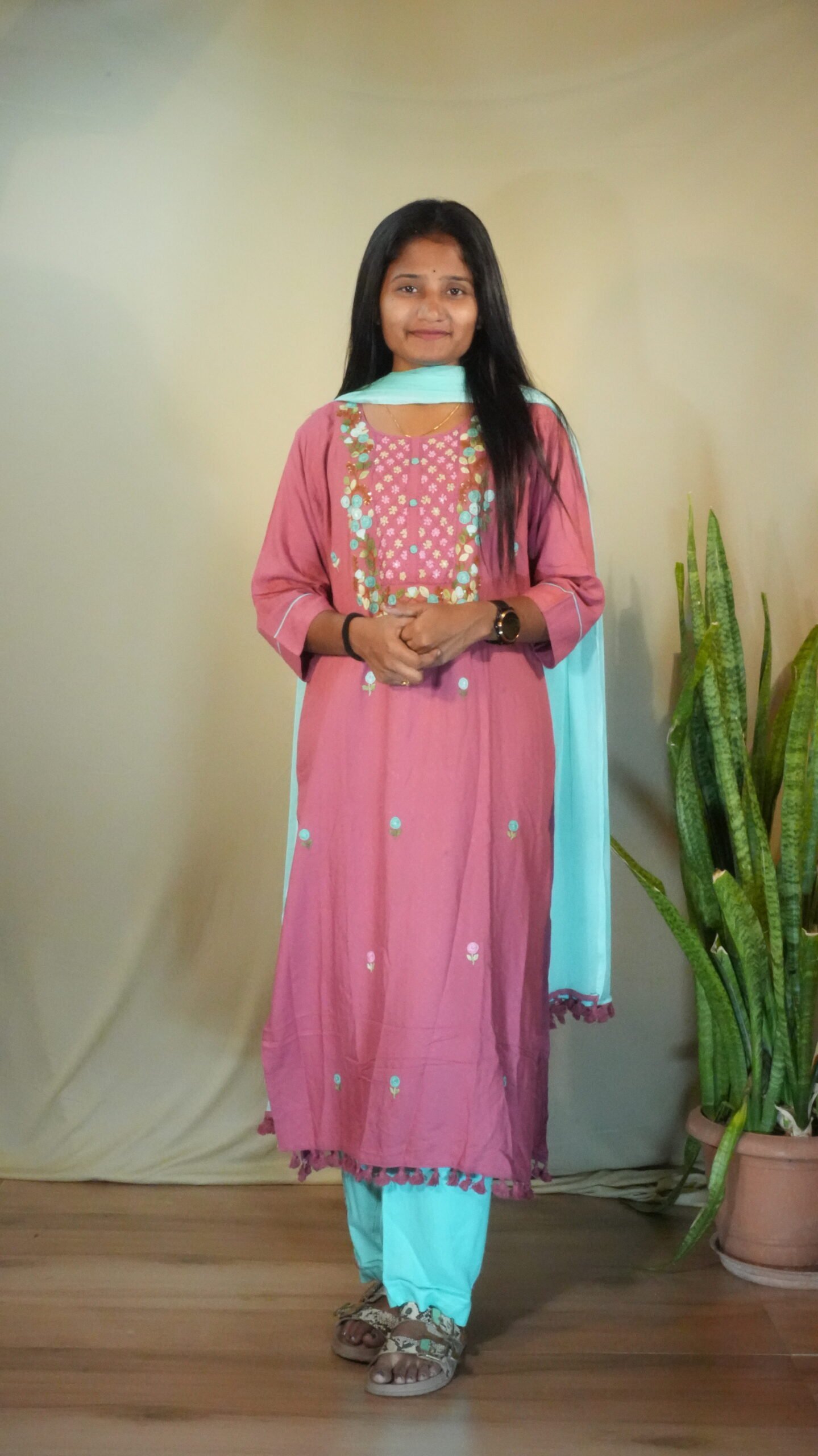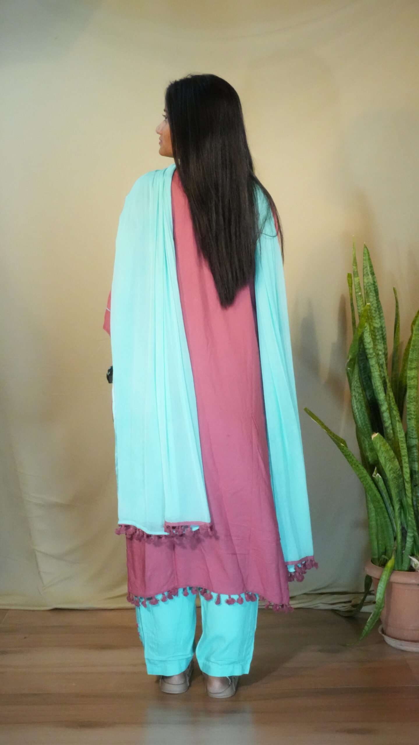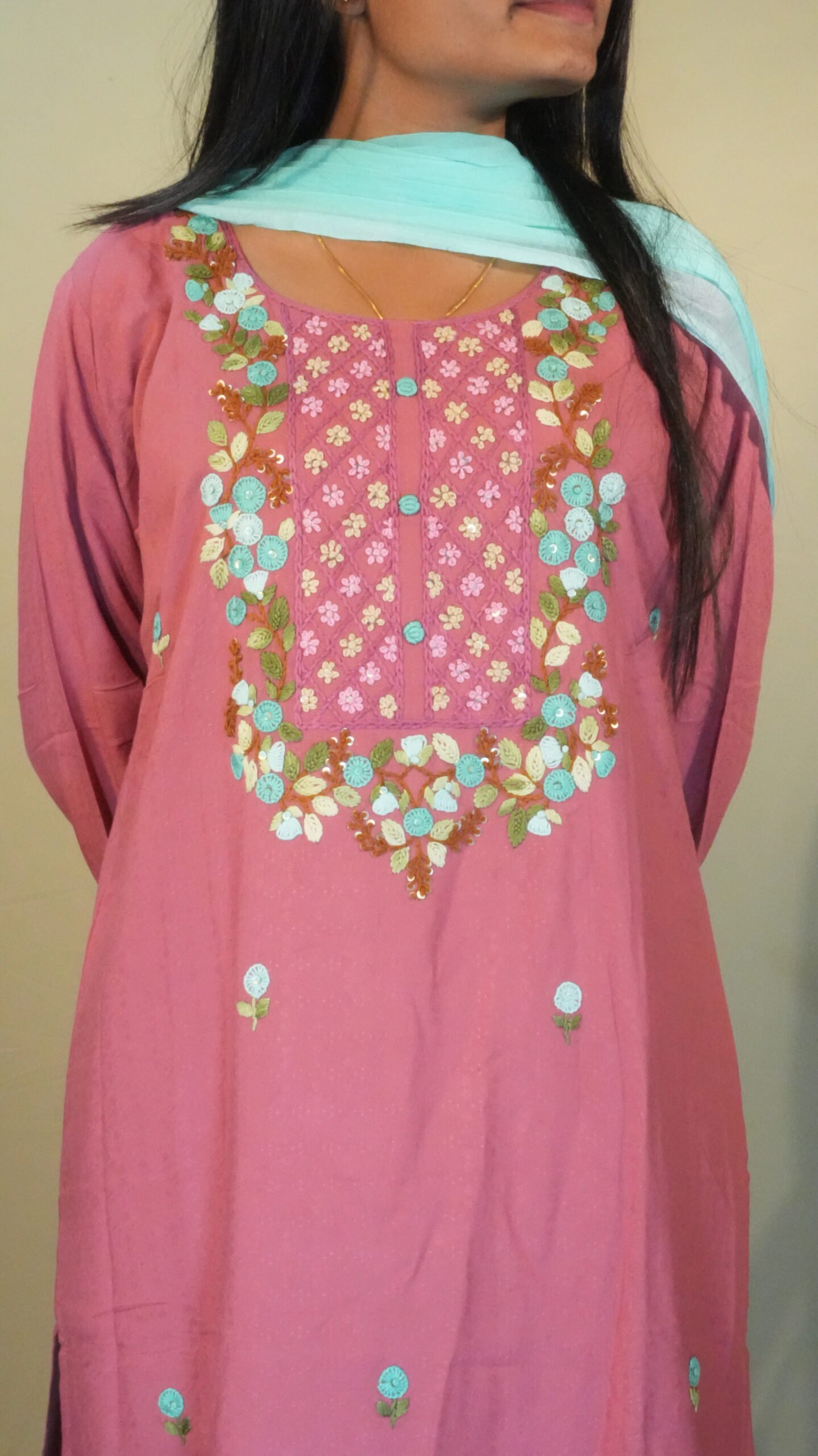 Made from soft, comfortable Rayon/Viscose fabric, the straight-cut Kurta offers an excellent drape. The yoke is the centerpiece, adorned with detailed floral thread embroidery in rich multi-colours. The hem of the kurta and the dupatta are finished with charming tassel detailing. The set is completed with contrasting Aqua Blue straight pants and a matching dupatta, elevating the entire ensemble.