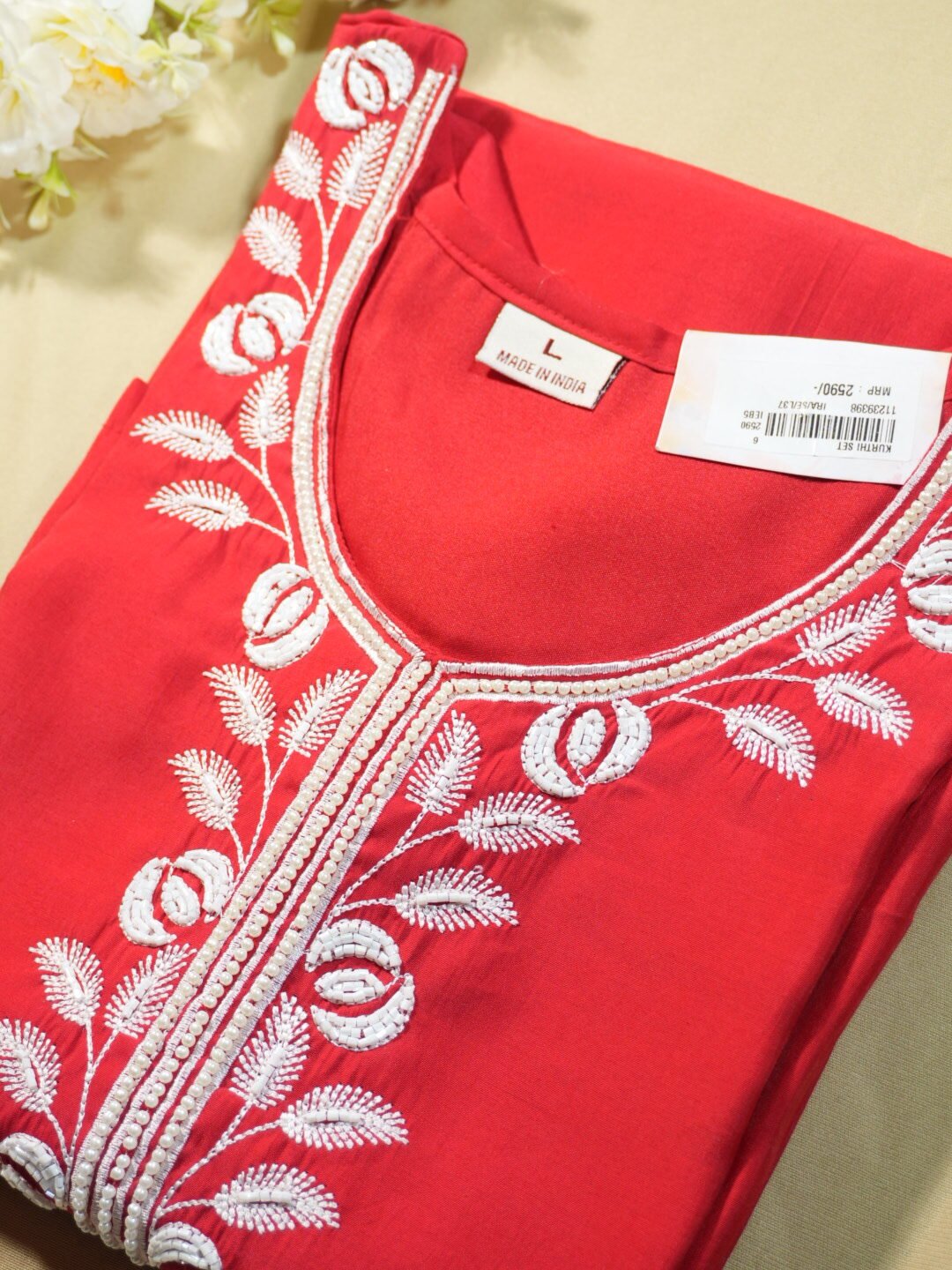 This elegant red kurta set is crafted from high-quality, breathable fabric to ensure all-day comfort and effortless style. The kurta features detailed white floral embroidery along the neckline, adding a refined ethnic charm to the overall design. The rich red hue enhances its festive appeal, making it suitable for traditional gatherings, celebrations, and everyday ethnic wear.