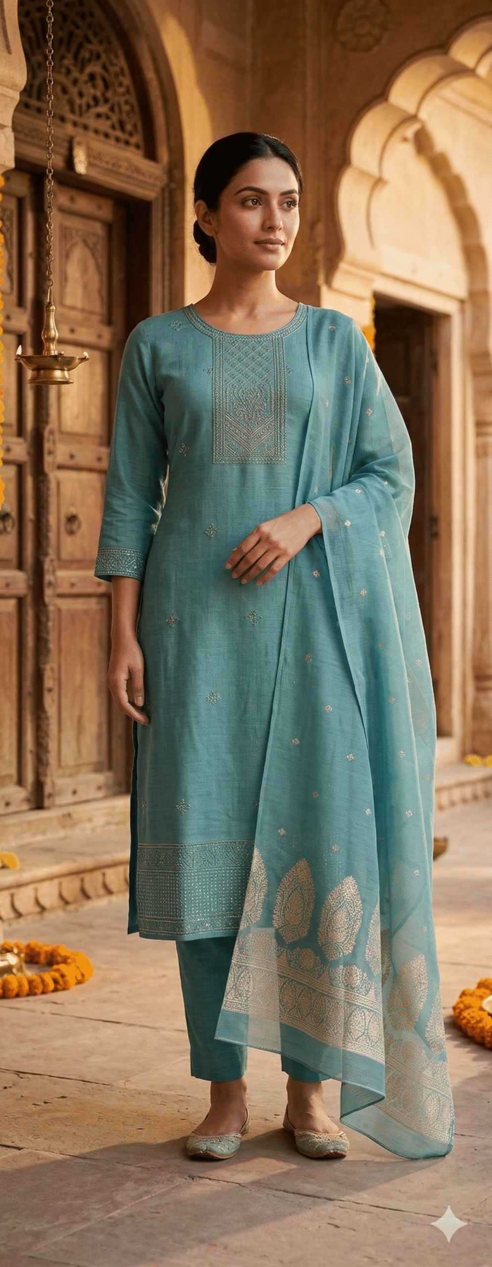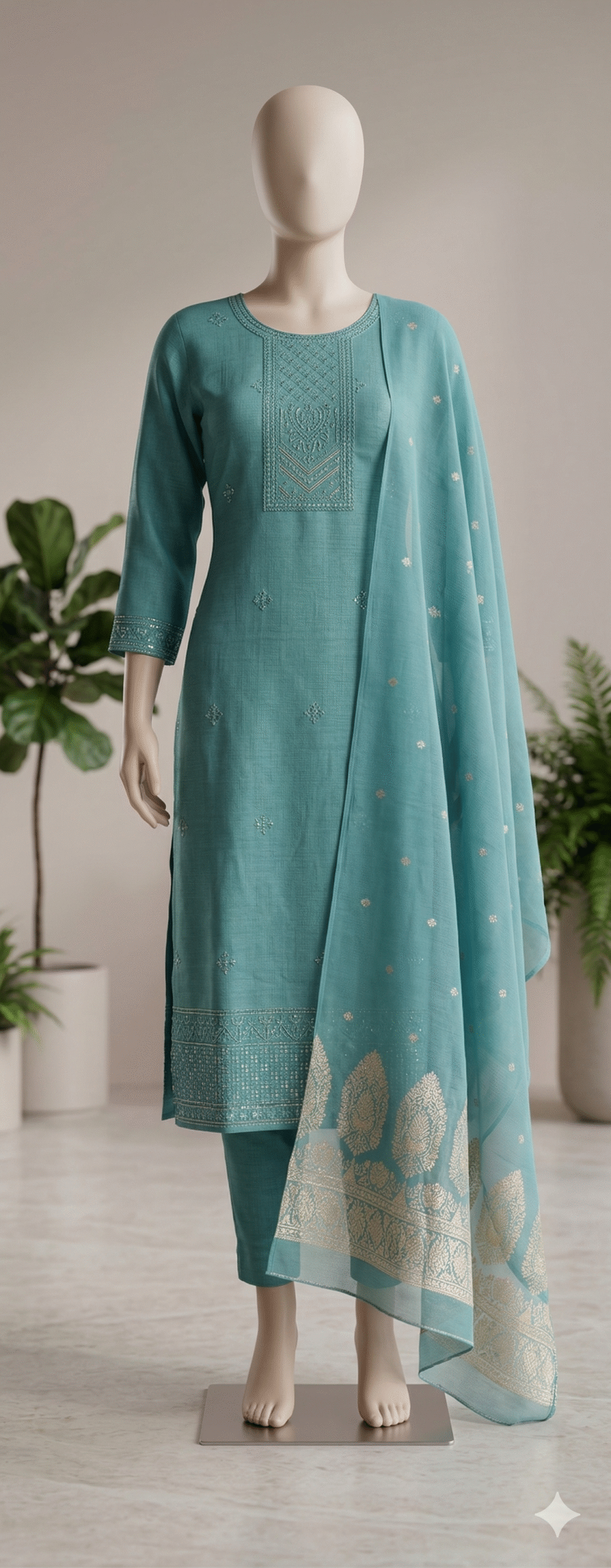 A soothing teal kurta set featuring intricate woven and embroidered detailing on the neckline and hem, paired with matching pants and a gracefully patterned dupatta. This ensemble blends subtle sophistication with timeless traditional appeal, perfect for both casual and festive occasions.