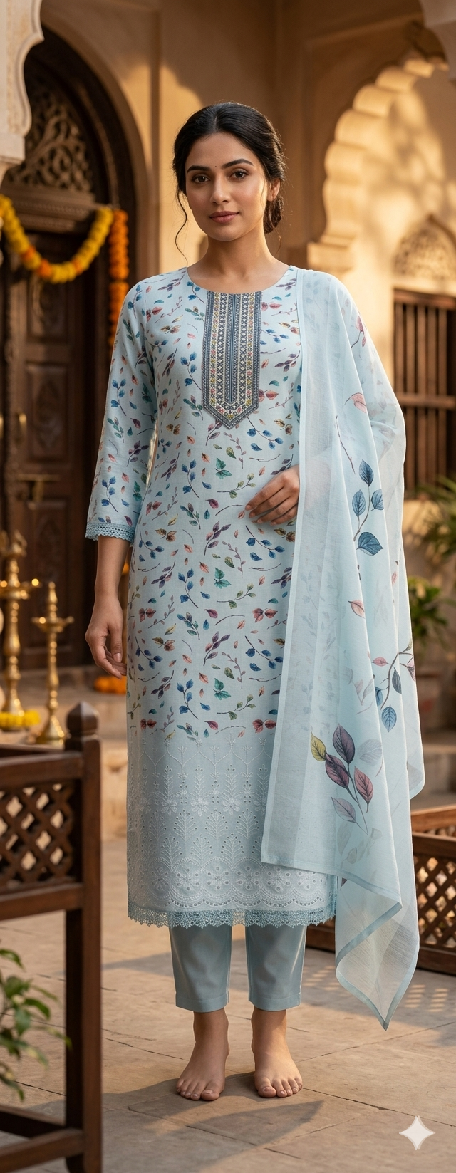 Floral Dupatta: Includes a lightweight, matching blue scarf with large leaf motifs that perfectly complements the kurta.