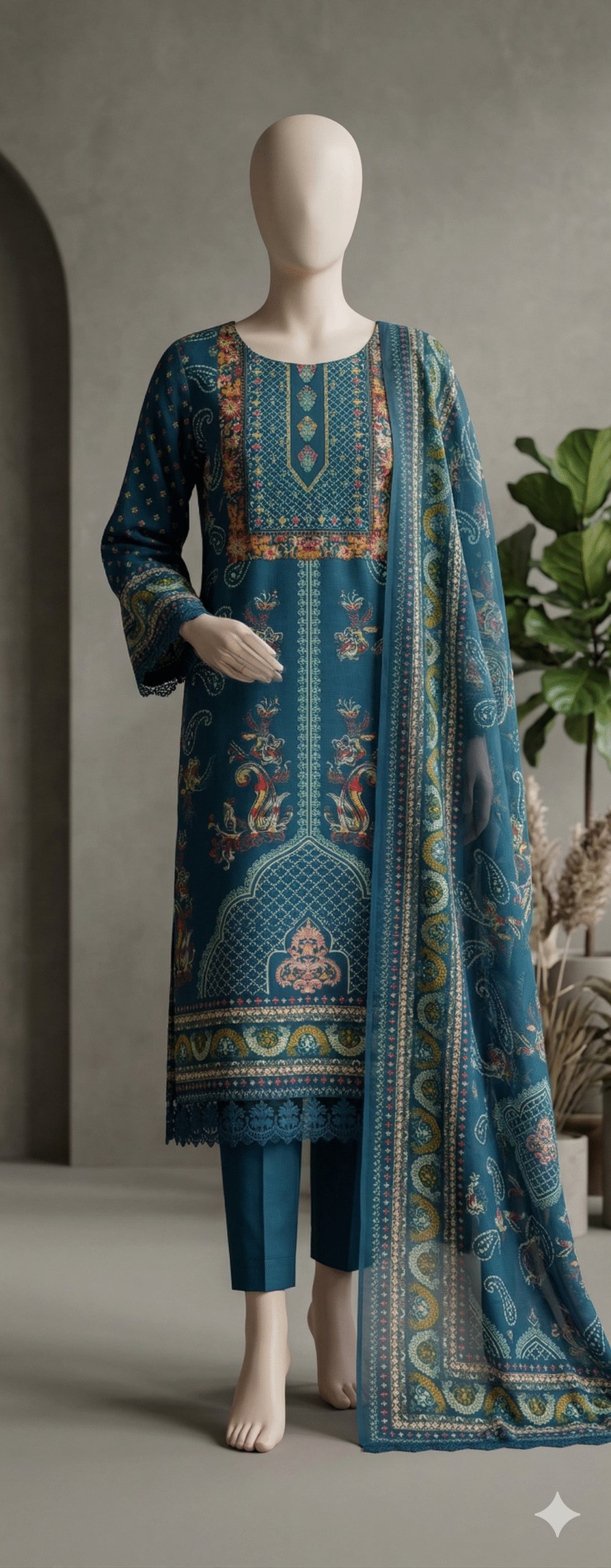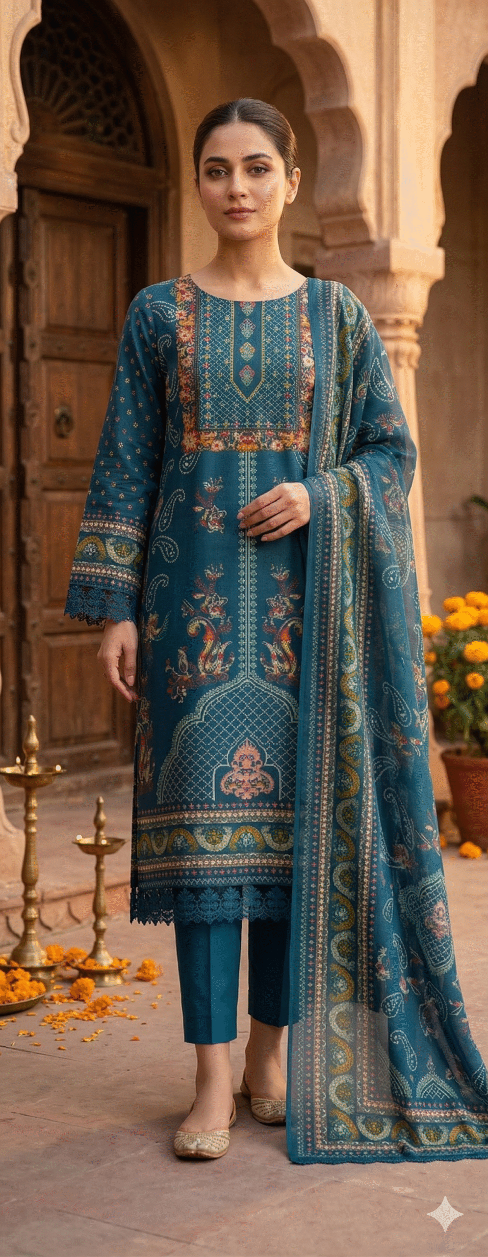 Elegant Dupatta: Comes with a lightweight, matching teal scarf covered in delicate prints and a thick decorative border that adds a graceful flow to the look.