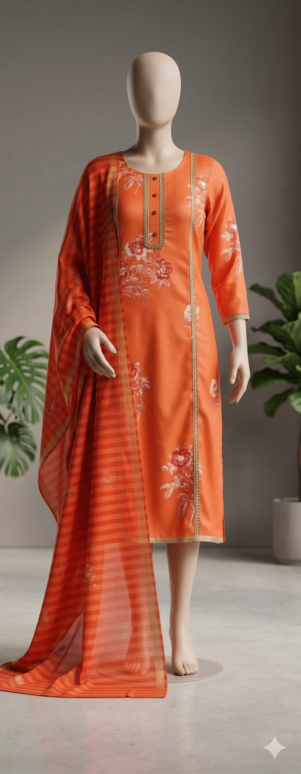 Brighten your festive wardrobe with this energetic three-piece suit set in a bold orange hue. Featuring a mix of beautiful floral prints and classic patterns, this outfit is designed for those who love a pop of color and traditional style.