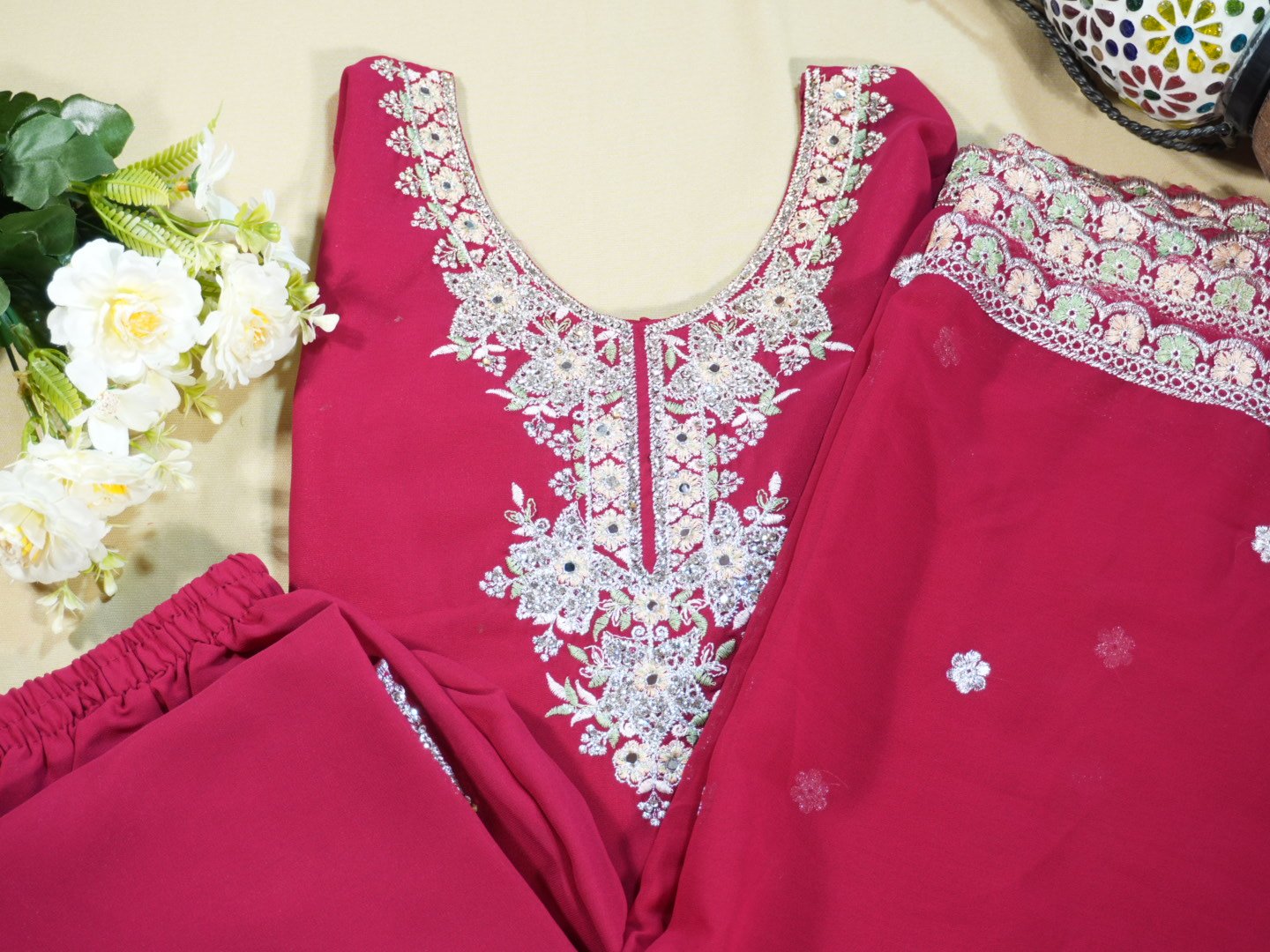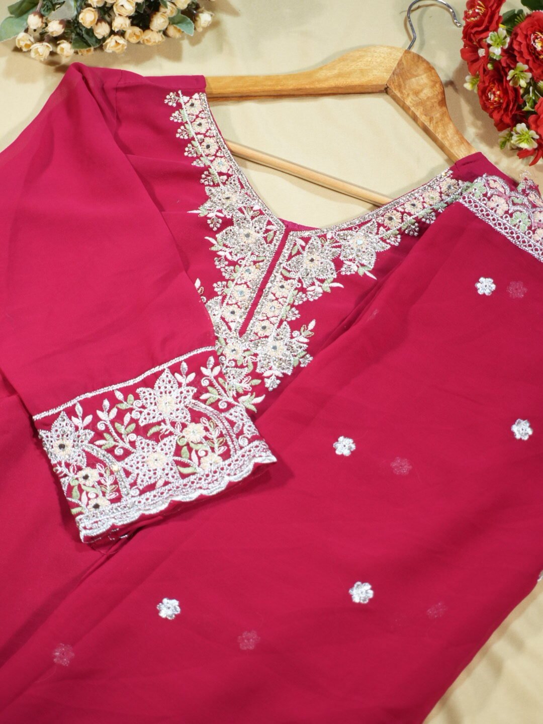Elegant pink embroidered kurti set featuring intricate floral neckline work, matching bottoms, and a coordinated dupatta. Perfect for festive occasions, weddings, and special events.